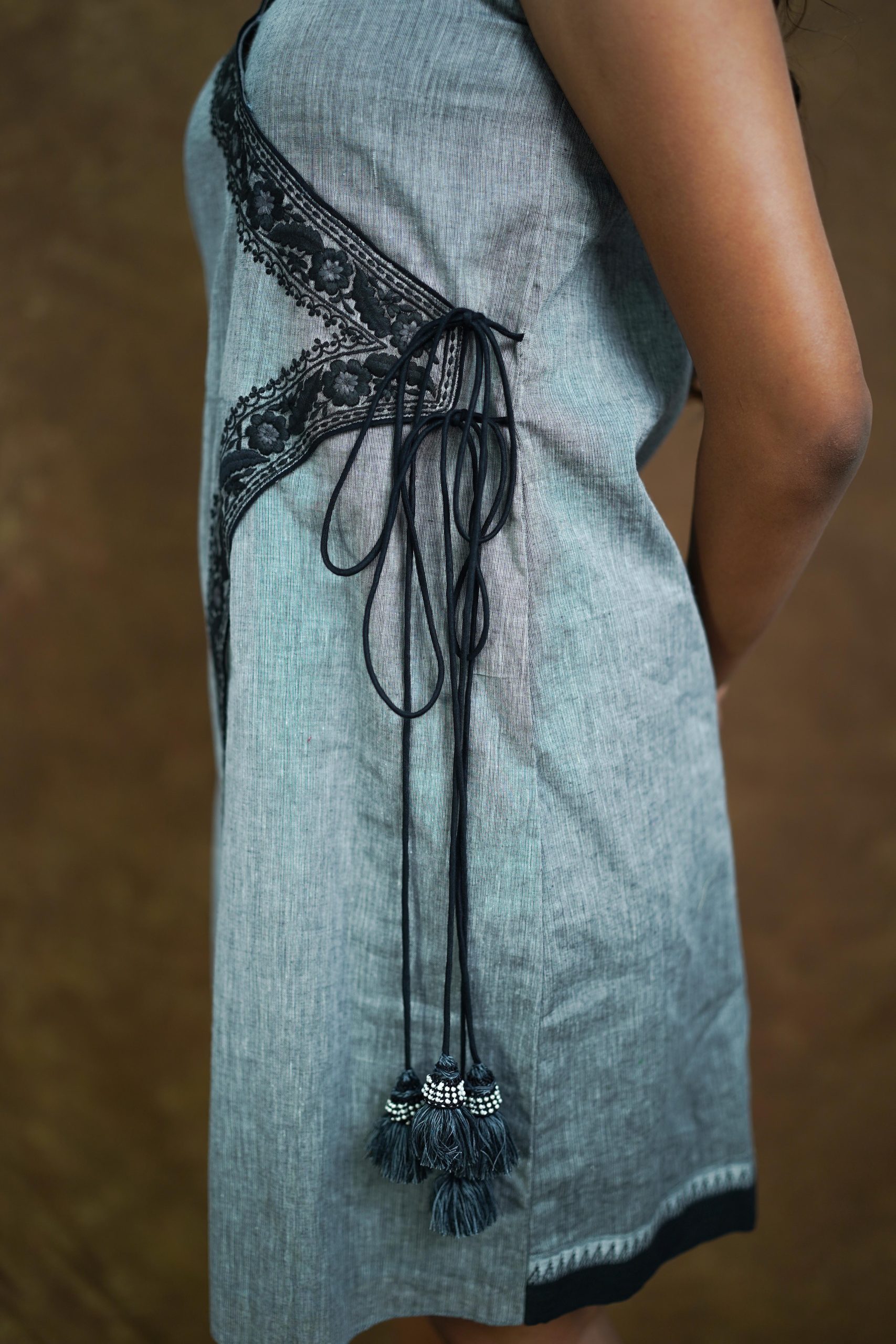“A seamless blend of heritage and contemporary style, this wrap-style dress brings the best of both worlds. The floral embroidery adds a touch of nostalgia, while the structured wrap silhouette with side tie-ups makes it effortlessly modern.