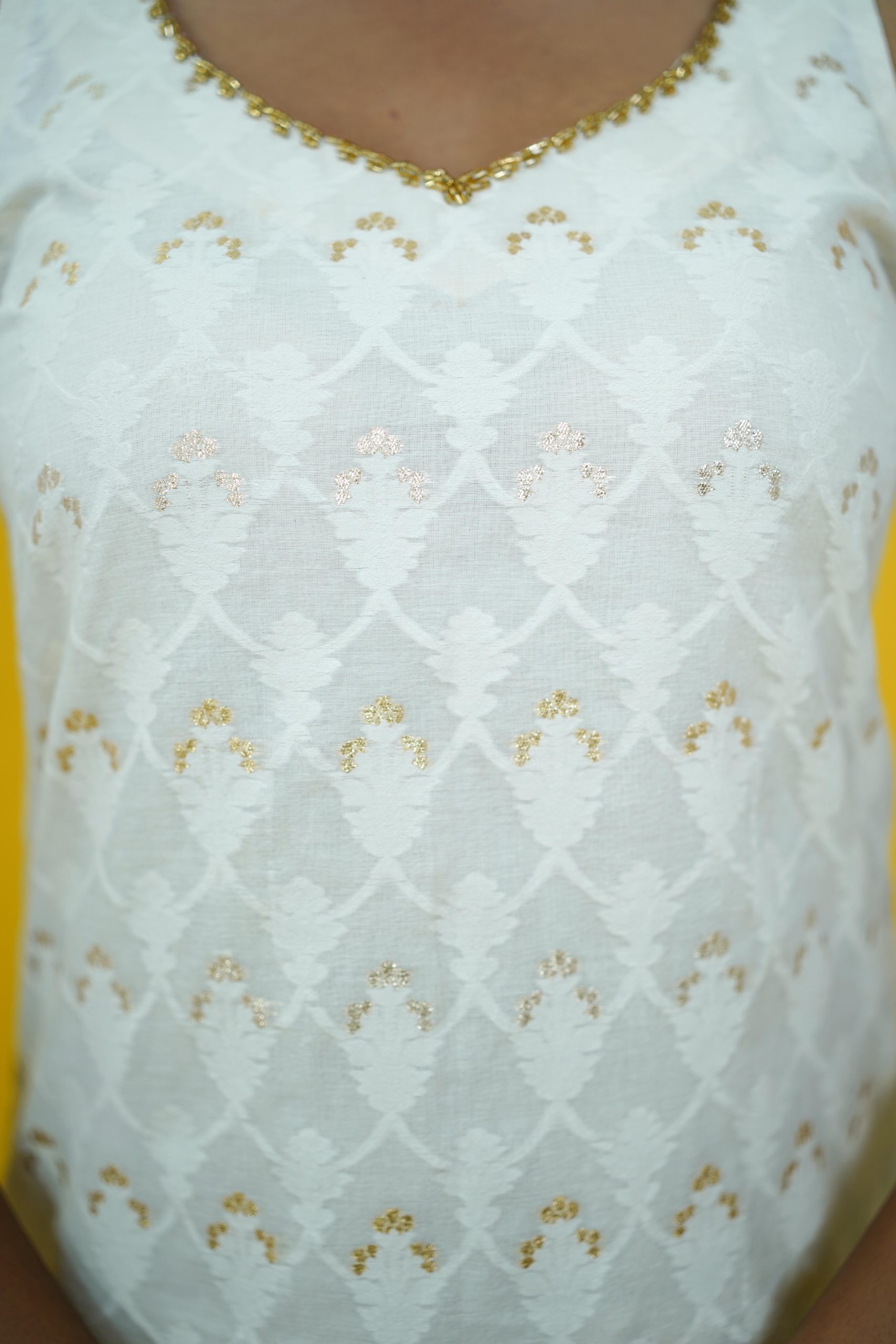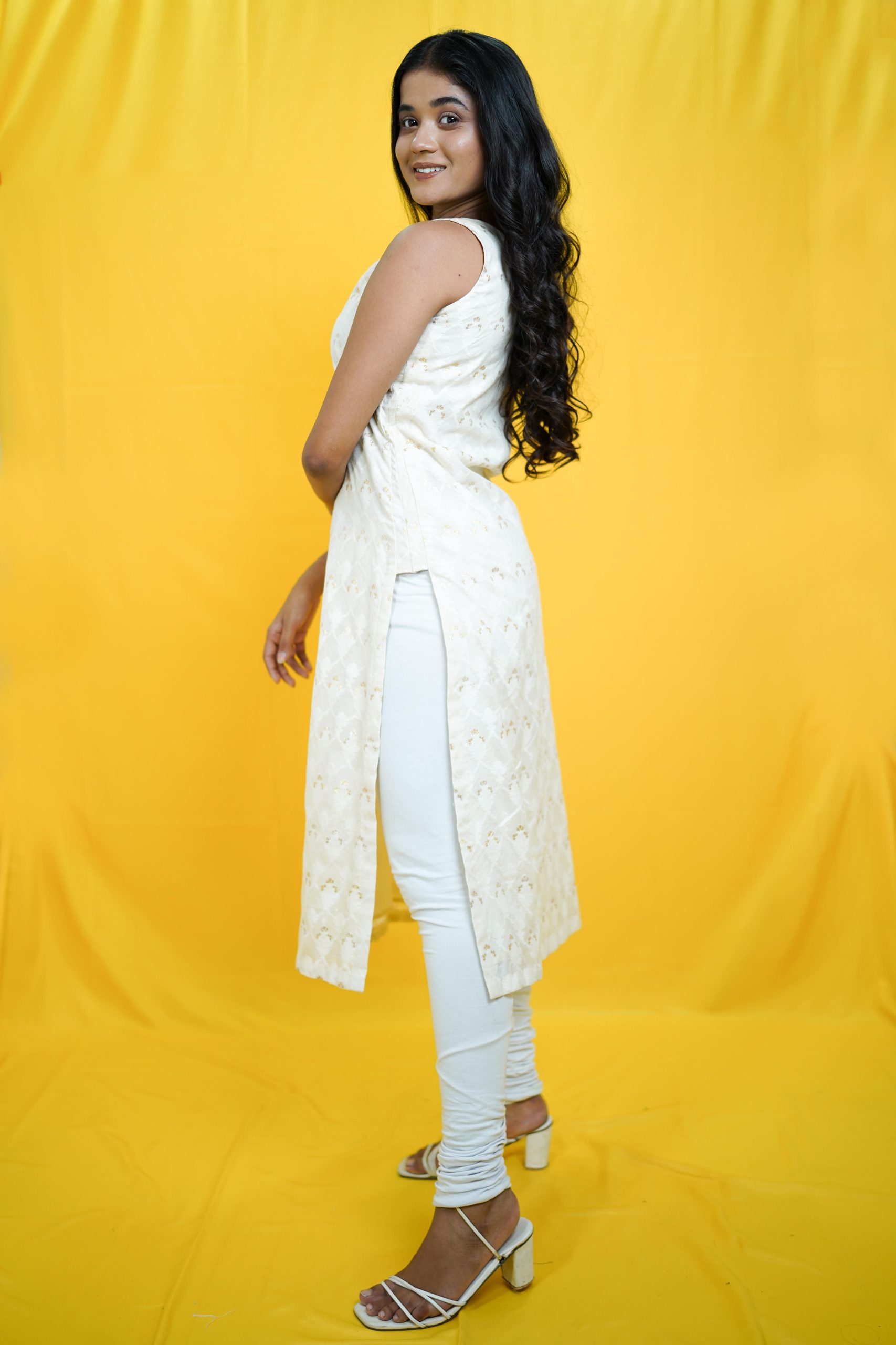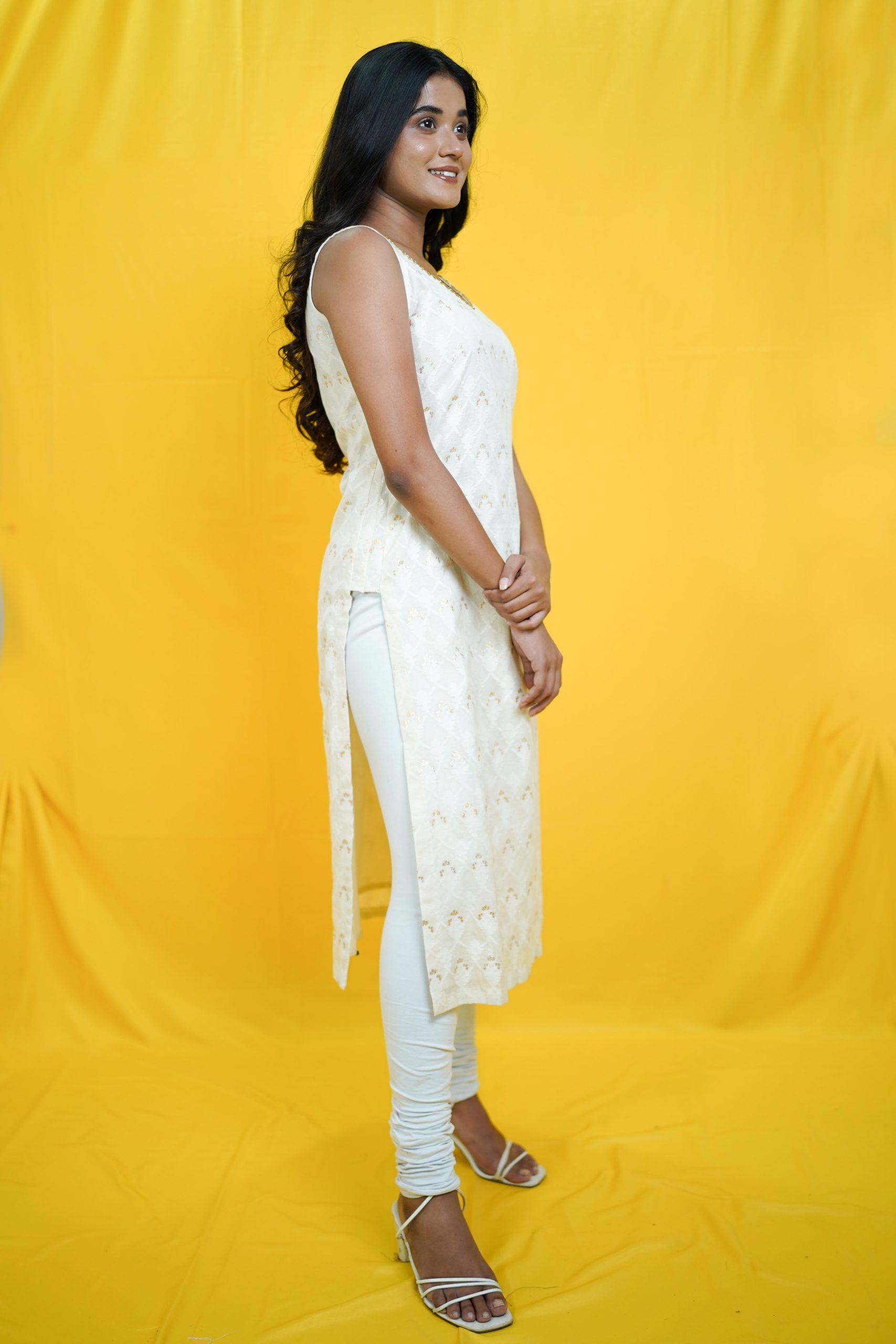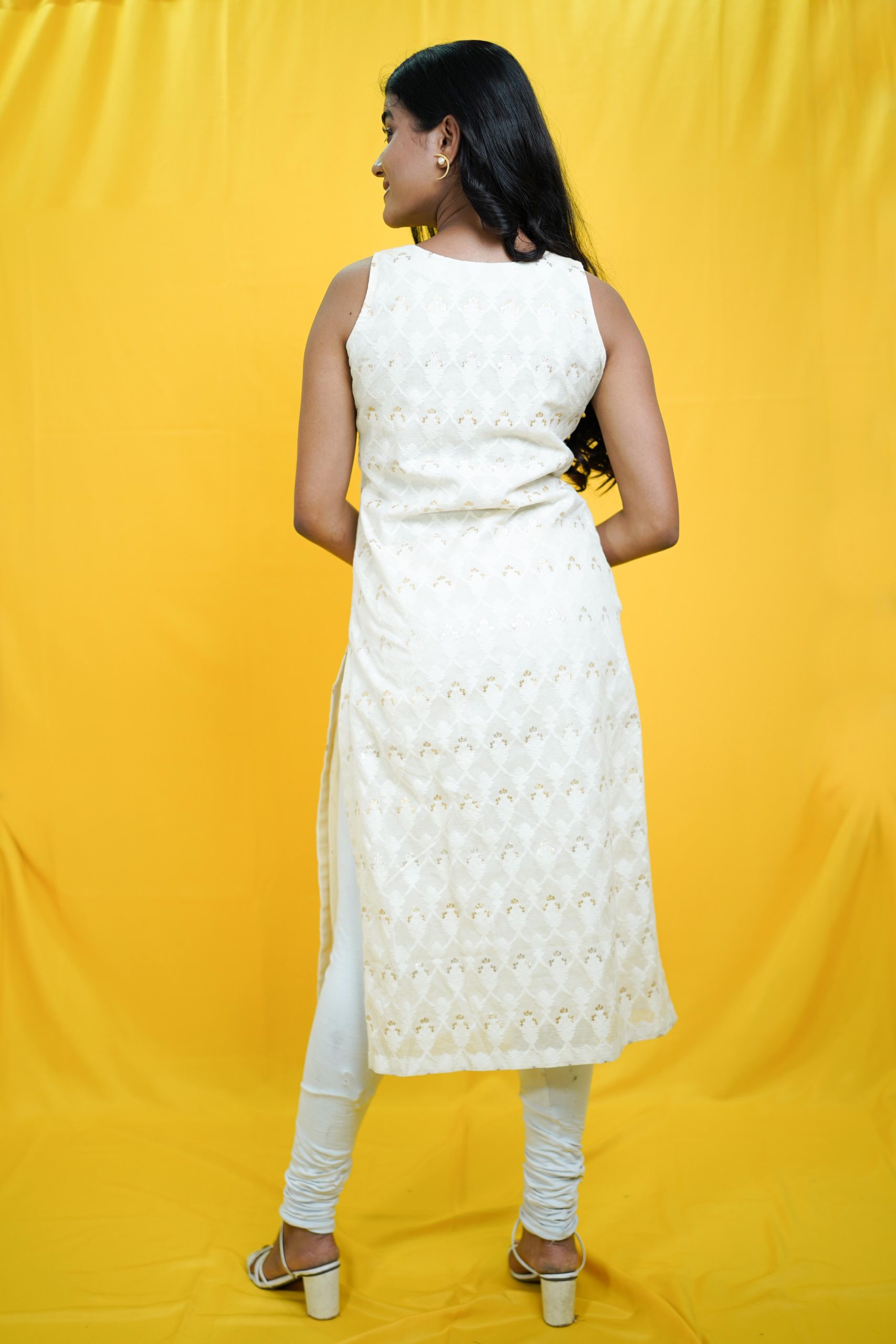 Elegant yet effortless, this sleeveless white cotton kurti blends festive charm with comfort. The subtle self-weaving adds texture, while the cut-dana detailing on the neckline brings a touch of shimmer. Pair it with white palazzos and gold Chandbalis for a graceful festive look!