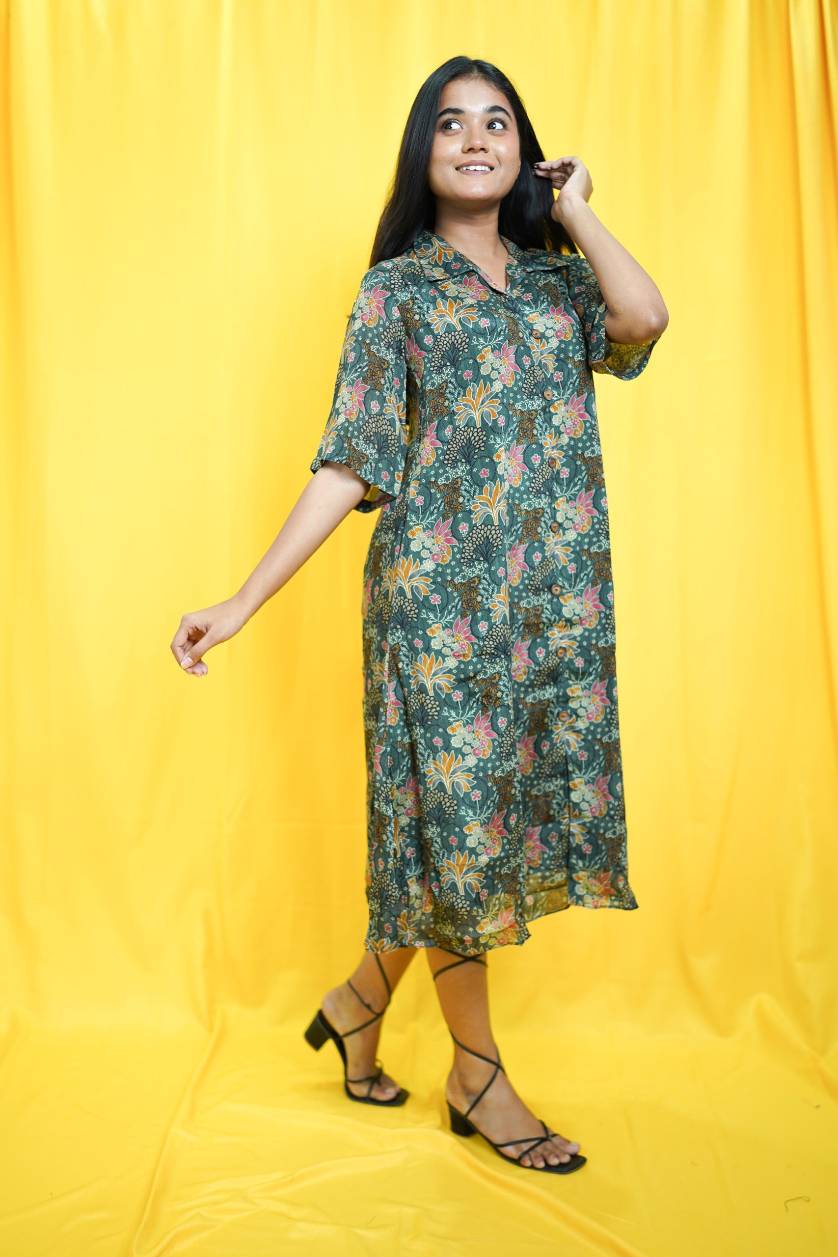 Crafted from chiffon, this loose fit shirt-dress is your go-to choice for effortless comfort and style. Pair it with sandals for a casual day out or layer with accessories for a chic look.
