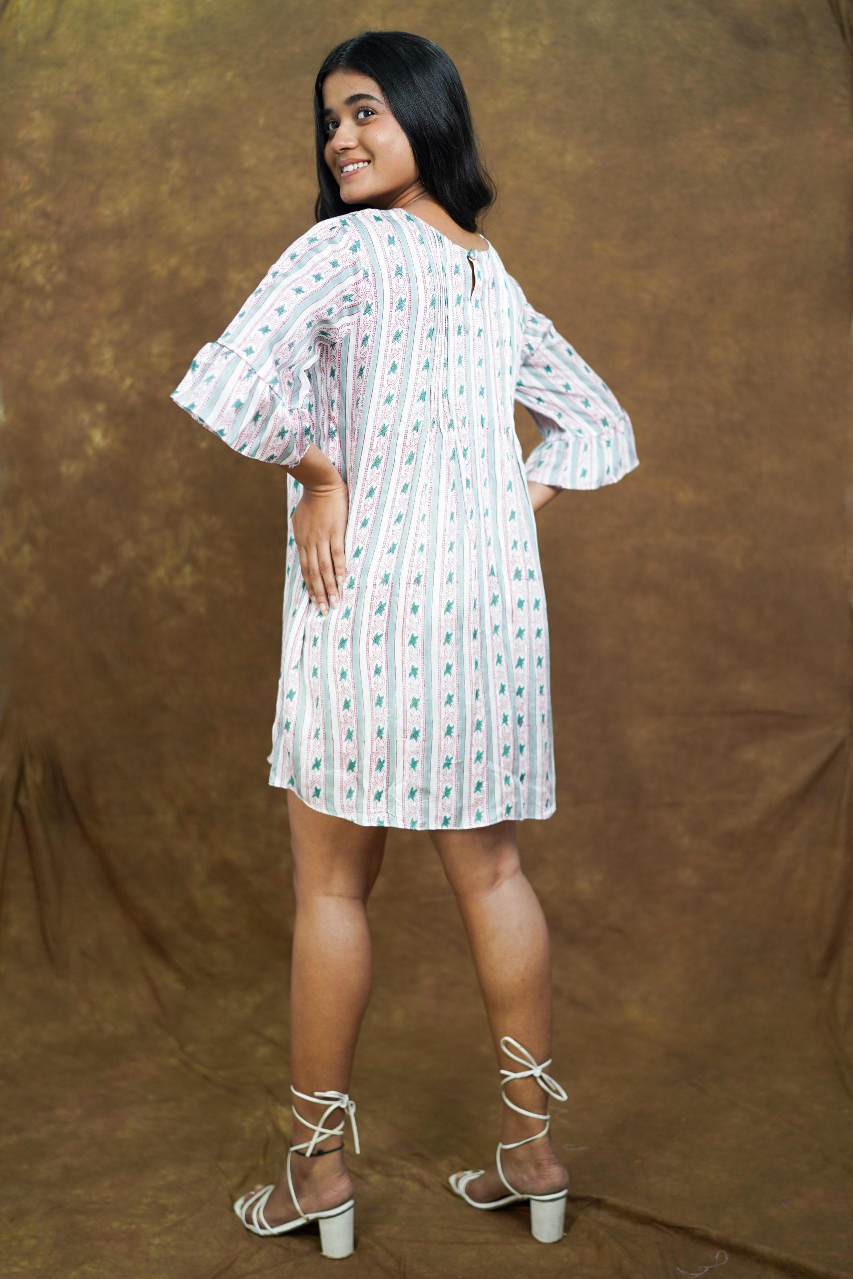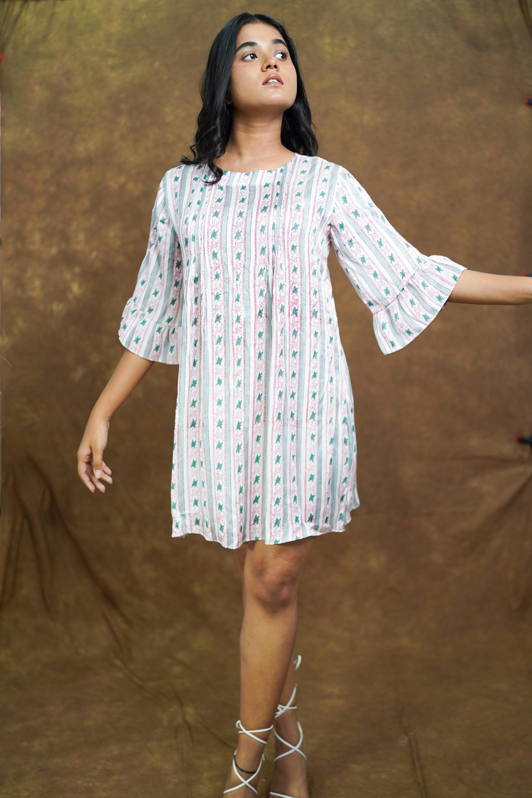 Crafted from Bagru-printed modal silk, this above-the-knee shift dress blends comfort with effortless style. Designed with delicate front pleats and playful frilled sleeves, it offers a breezy, flowy silhouette—perfect for everyday wear. Pair it with comfy flats or strappy sandals and a tote bag for a relaxed yet chic daytime look