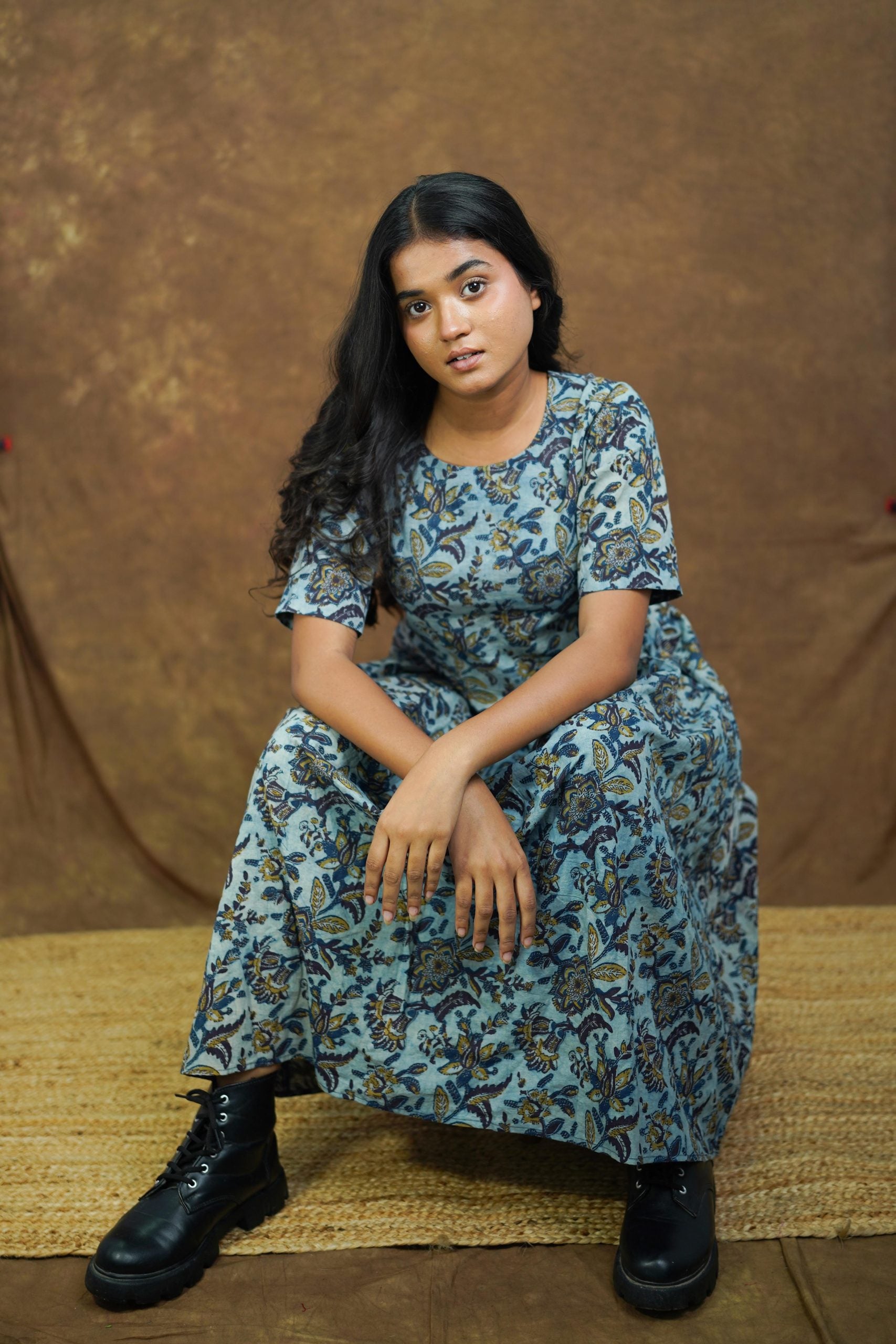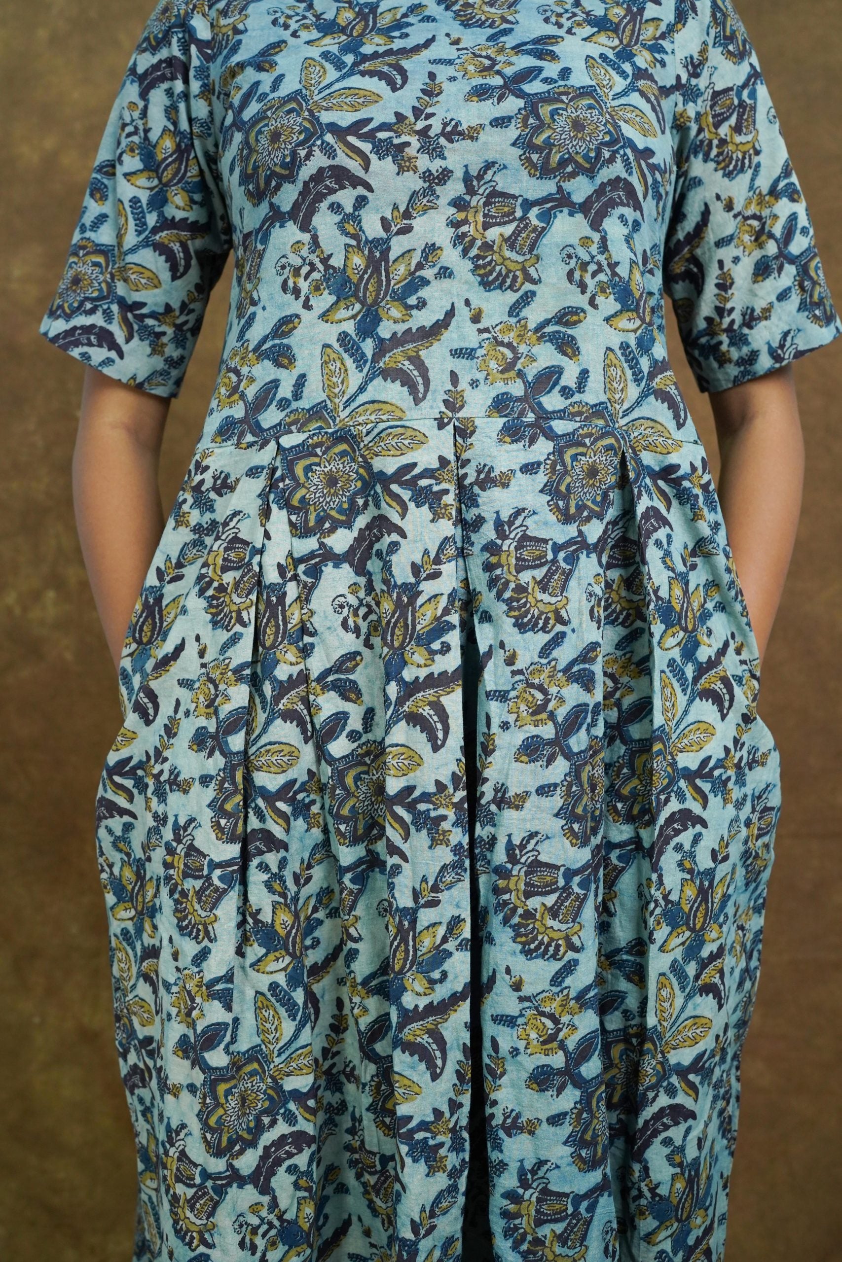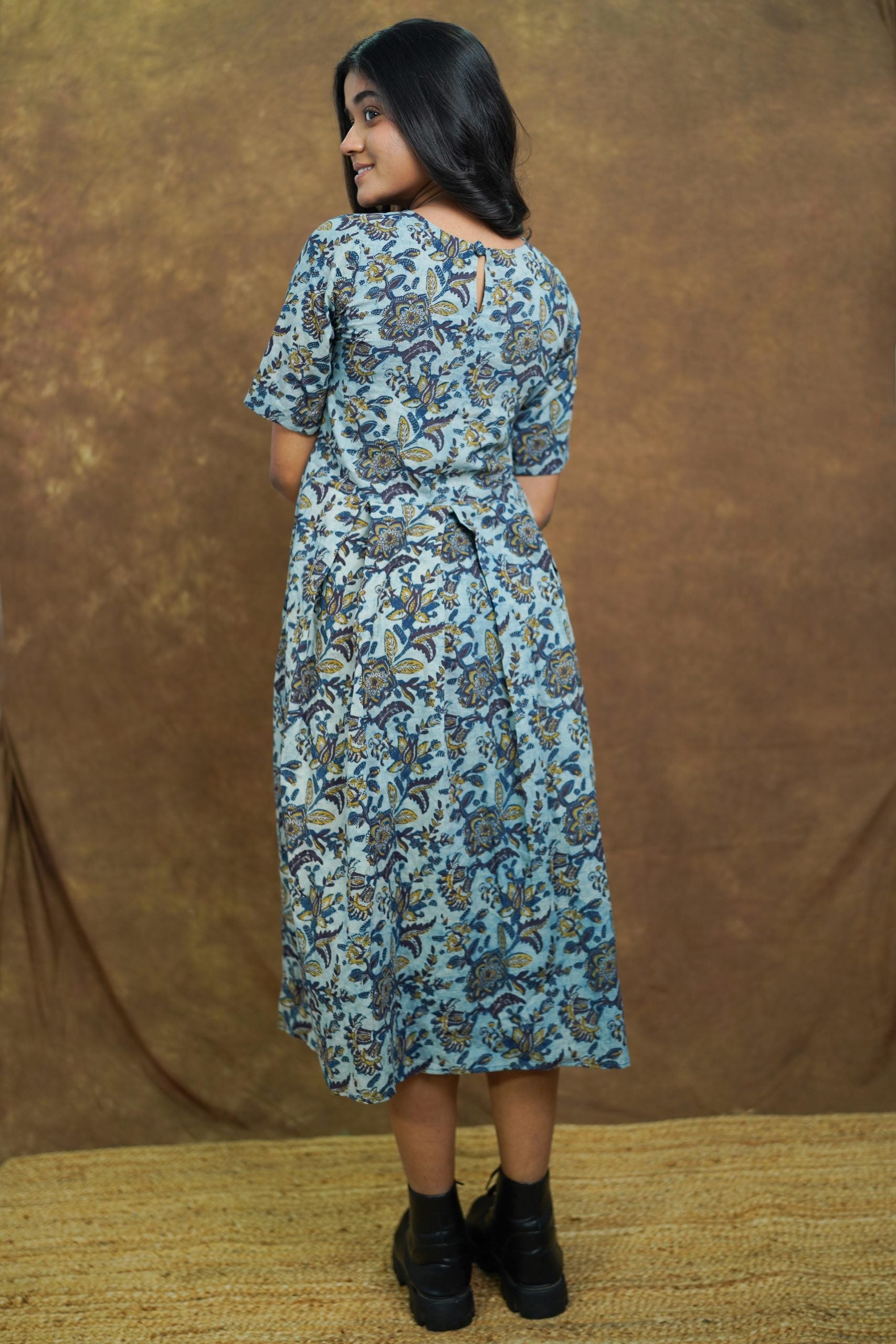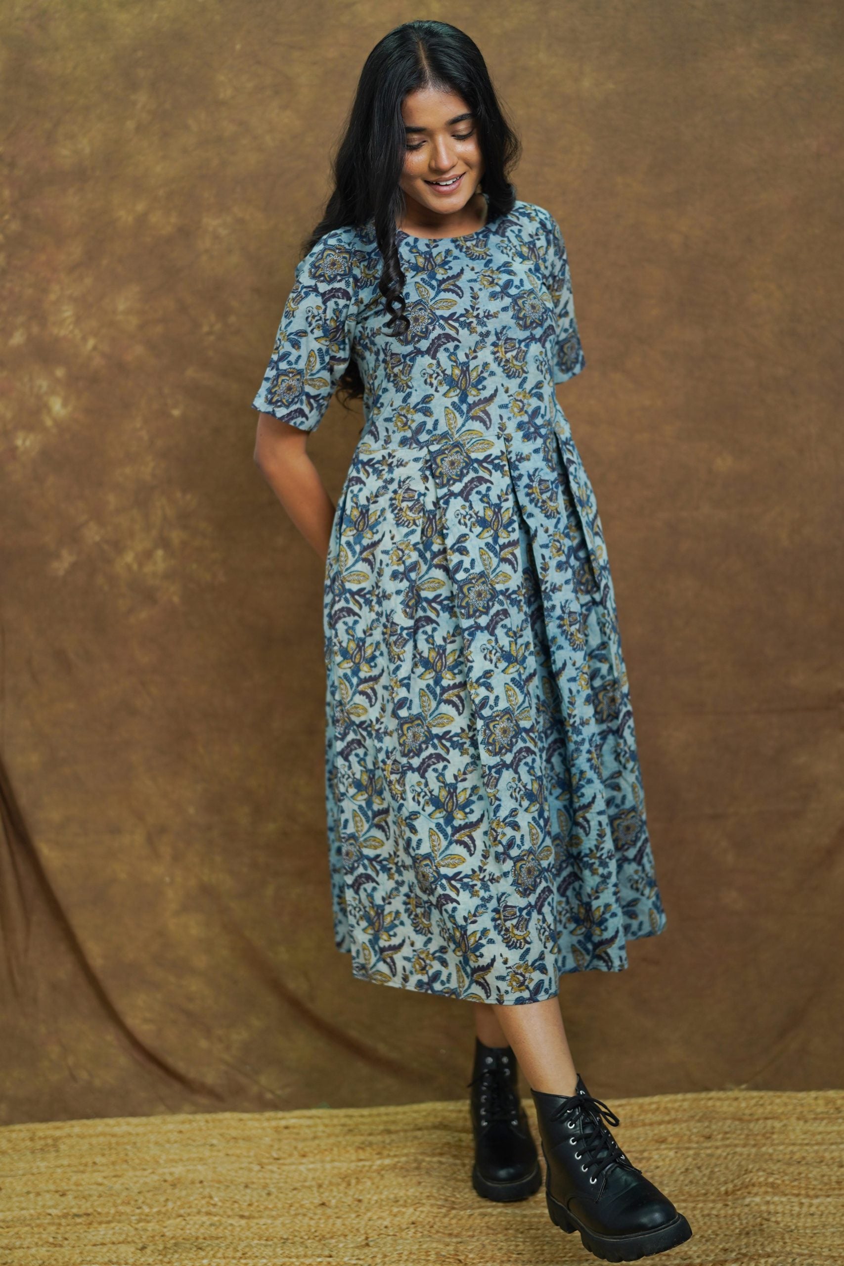 This cotton hand-block pure cotton printed dress can be your go to dress for work wear. Pair it with a wide belt and classic mules for a polished look.