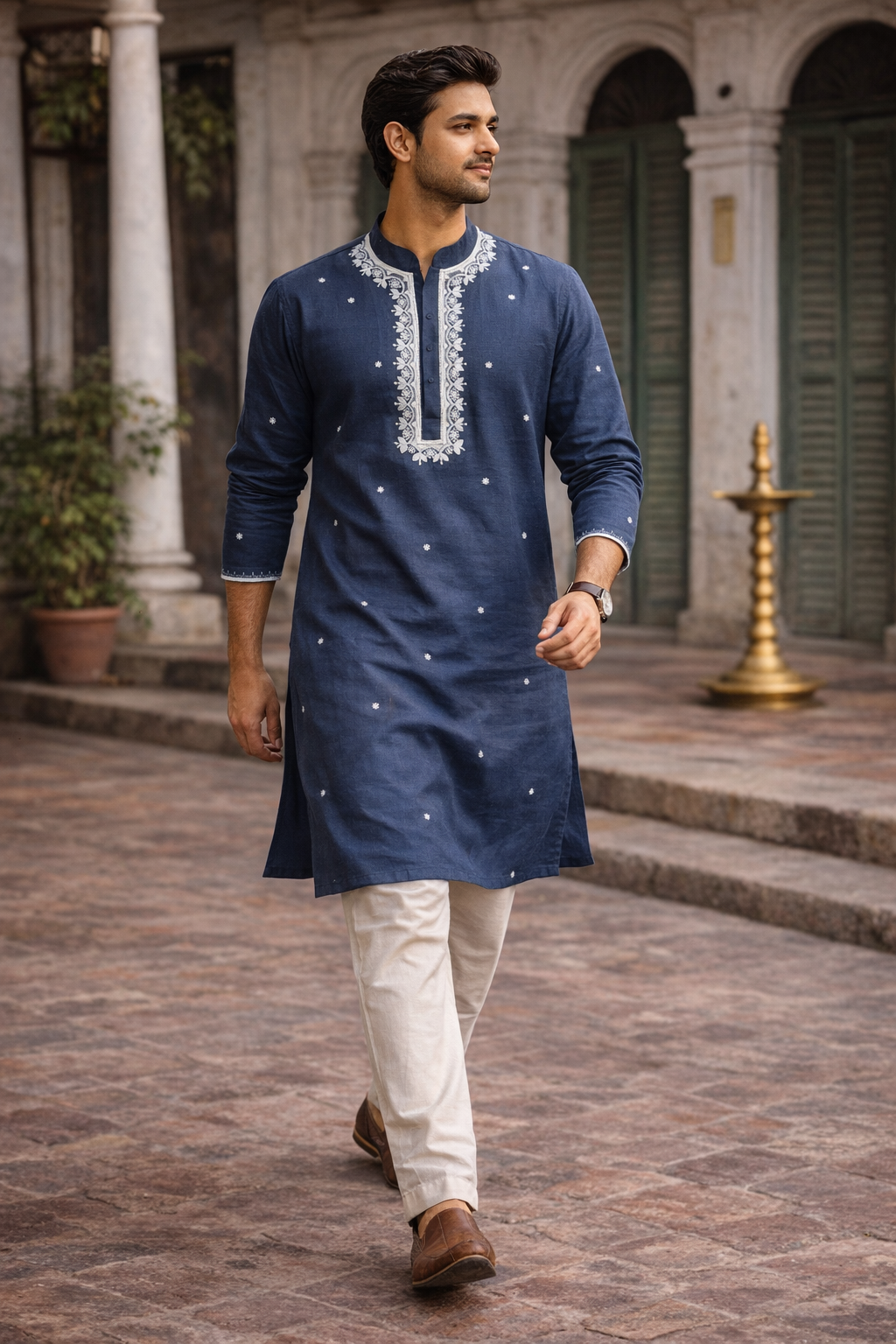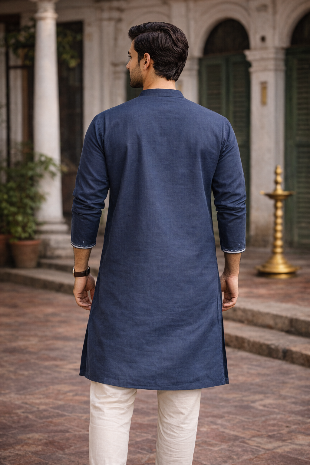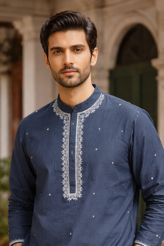 Step up your ethnic game with this classic greyish blue silk blend kurta for men. The deep elegant hue is beautifully complemented by delicate white embroidery along the neckline and placket, with subtle butta detailing throughout. Pair it with churidar or straight pants and classic mojaris for a polished, sophisticated look.