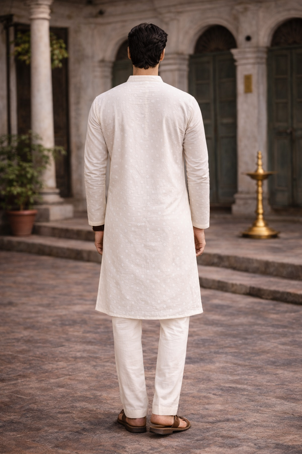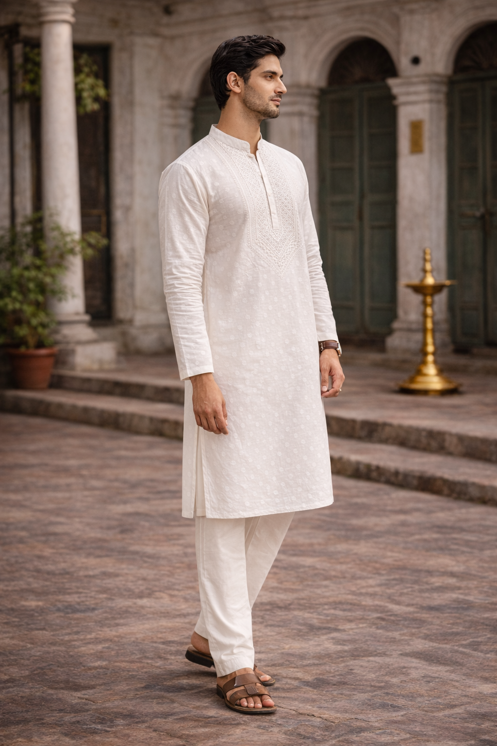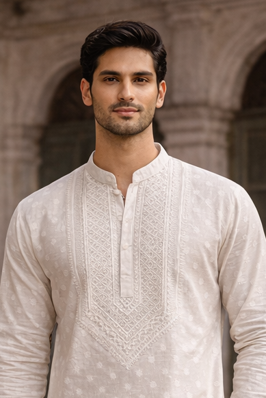 Step up your ethnic game with this white cotton kurta for men. The subtle, soothing tone is beautifully enhanced with intricate embroidery along the neckline and placket, adding understated festive charm. Pair it with churidar or straight pants and classic mojaris for a polished, graceful, and sophisticated look.