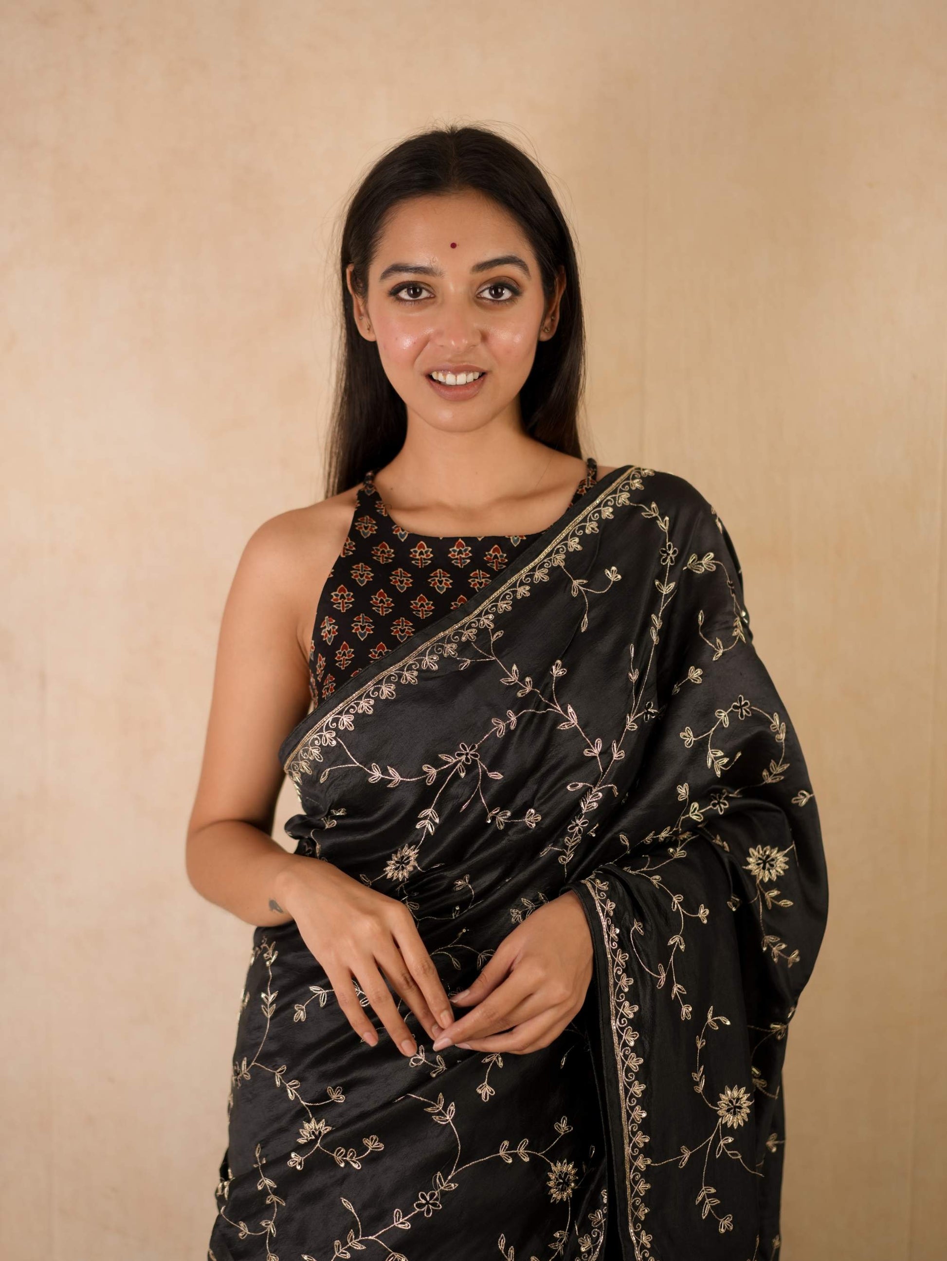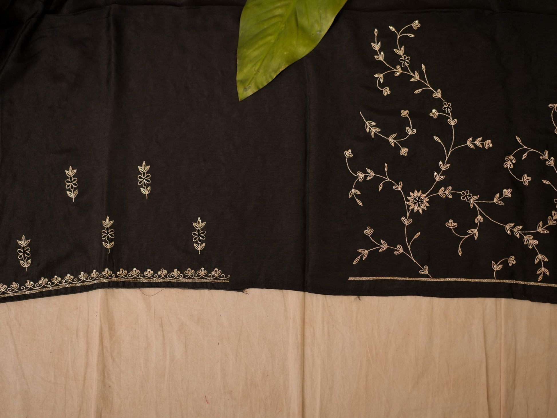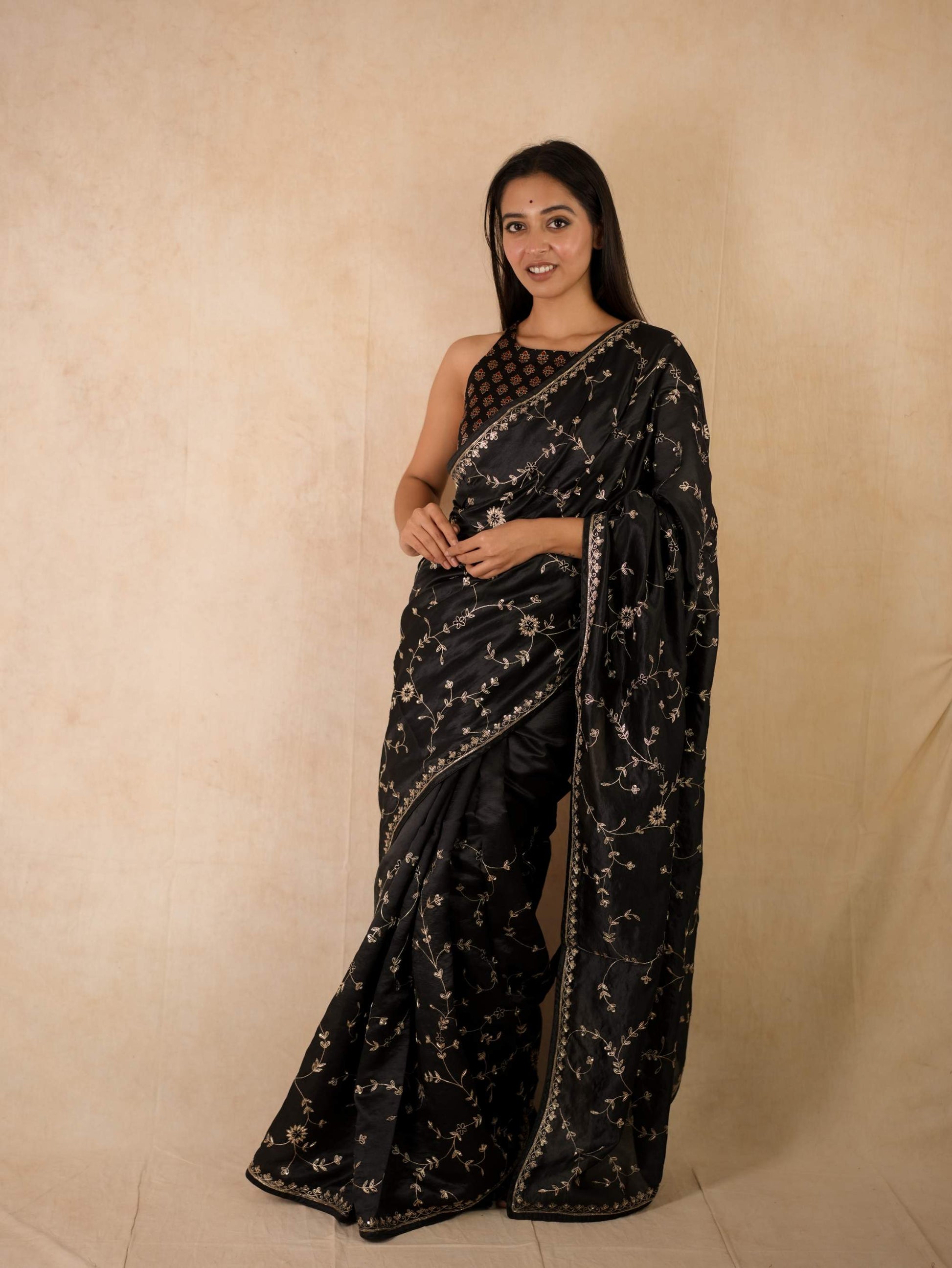 Drape yourself in pure elegance with our black luxurious Tussar silk saree, accentuated by exquisite hand pitai Zardosi embroidery. The natural texture of tussar silk paired with delicate detailing makes it a perfect ensemble for weddings, festive evenings, and grand celebrations. A true statement of timeless artistry and sophistication.