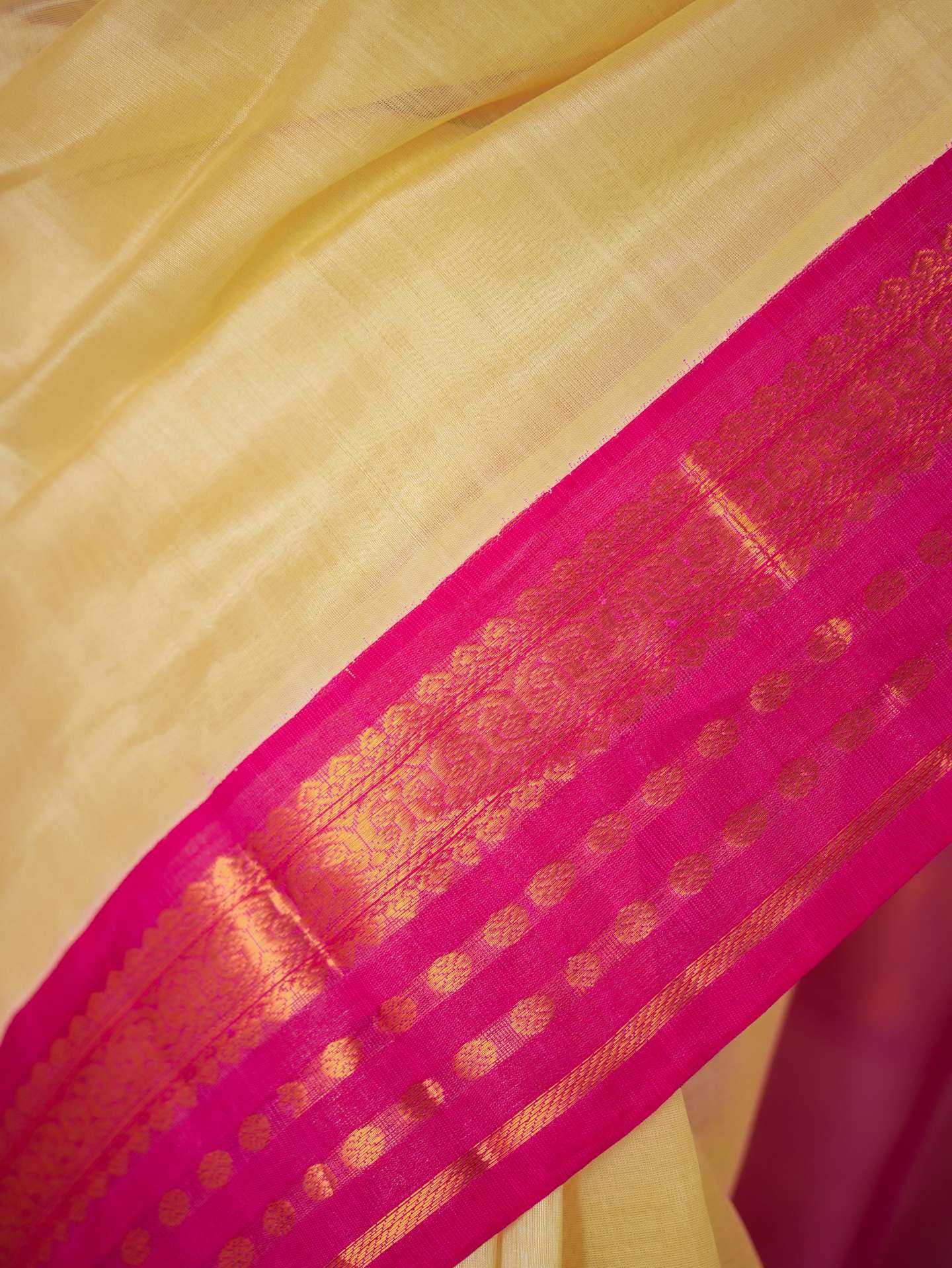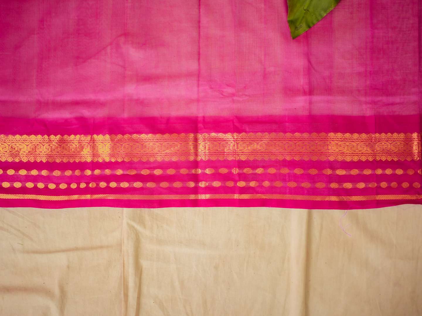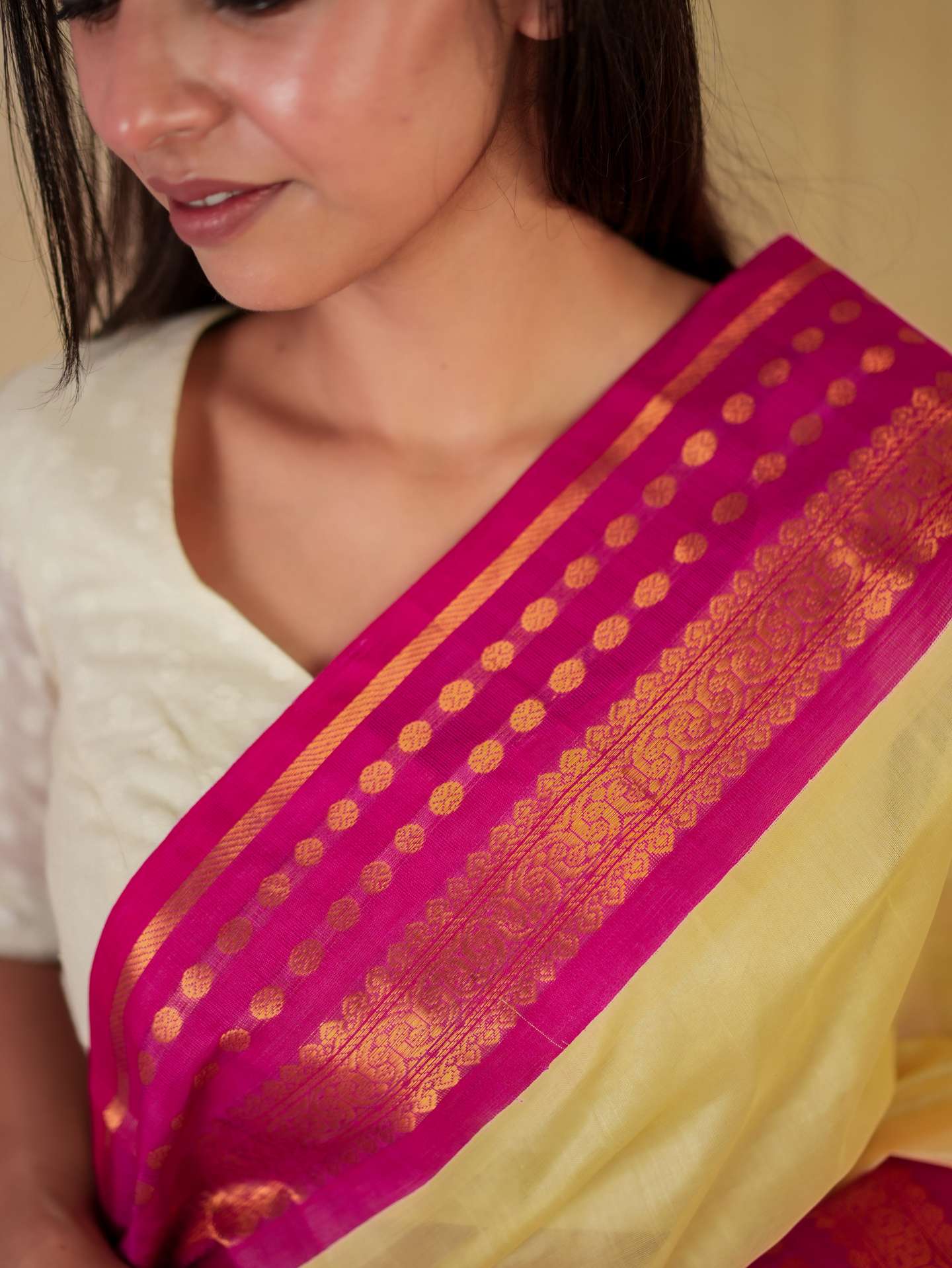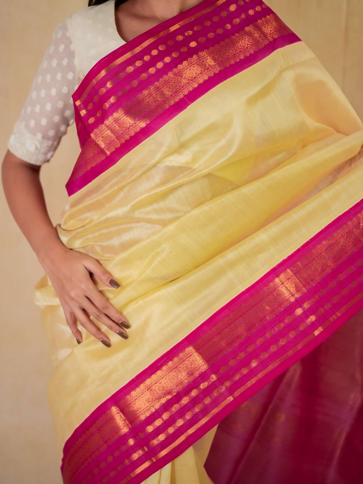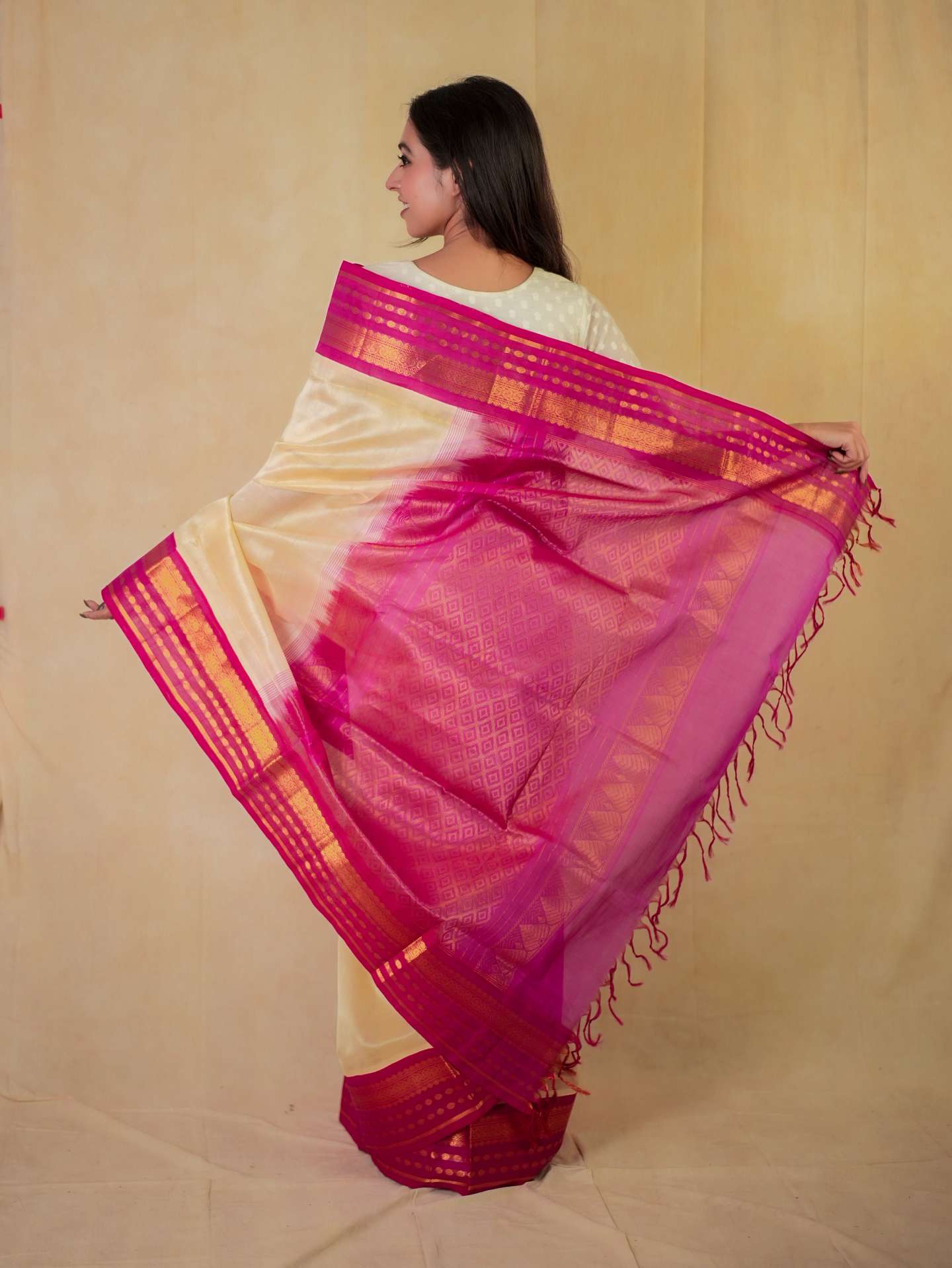 Introducing our elegant cream and rani pink Kanchipuram sico saree, featuring a graceful plain body that highlights its subtle charm. It is adorned with a rani pink border enriched with intricate golden zari work, while the pallu showcases traditional golden zari motifs, creating a beautiful contrast and timeless festive appeal.