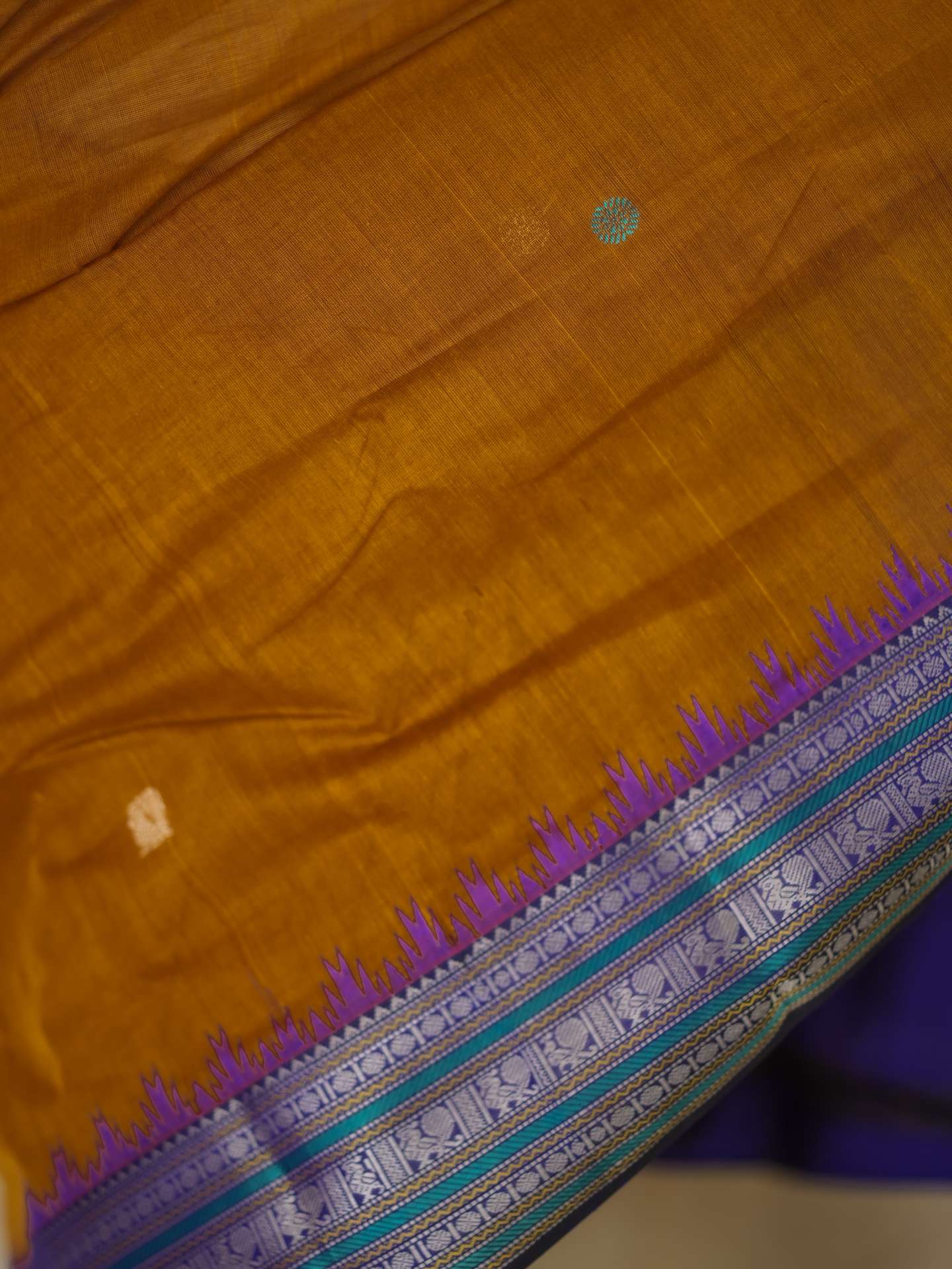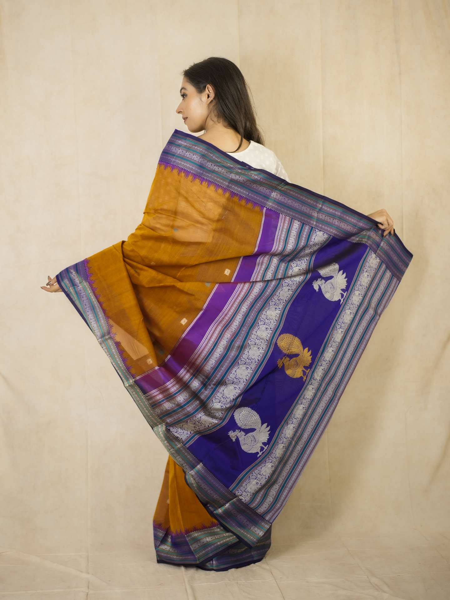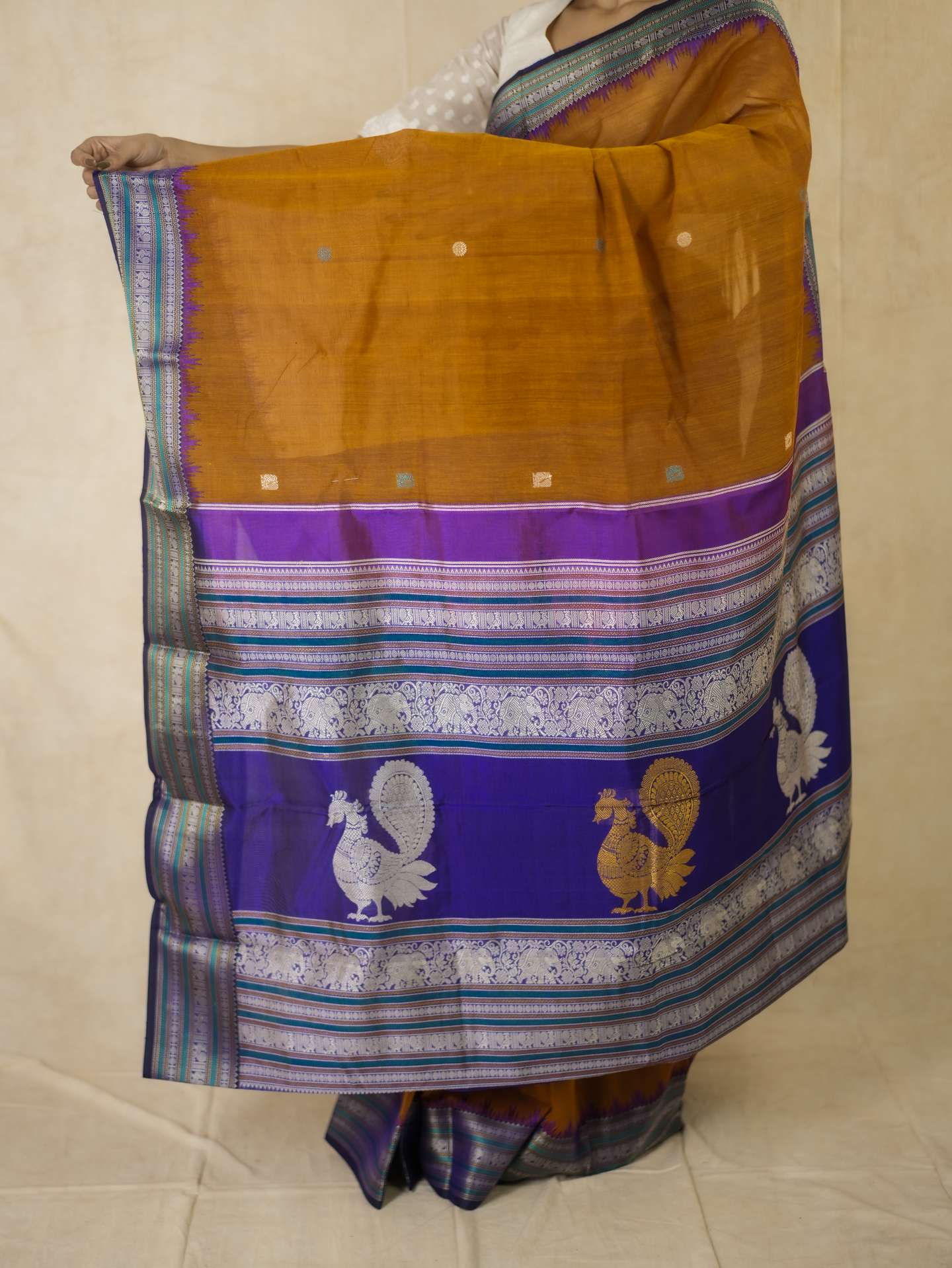 | Introducing our graceful Kanchi sico saree in a rich mustard cotton body highlighted with subtle green butta motifs and a regal purple silk border. The border is detailed with fine silver thread work, while the pallu features striking silver and golden woven peacock motifs, adding a majestic and elegant finish. |