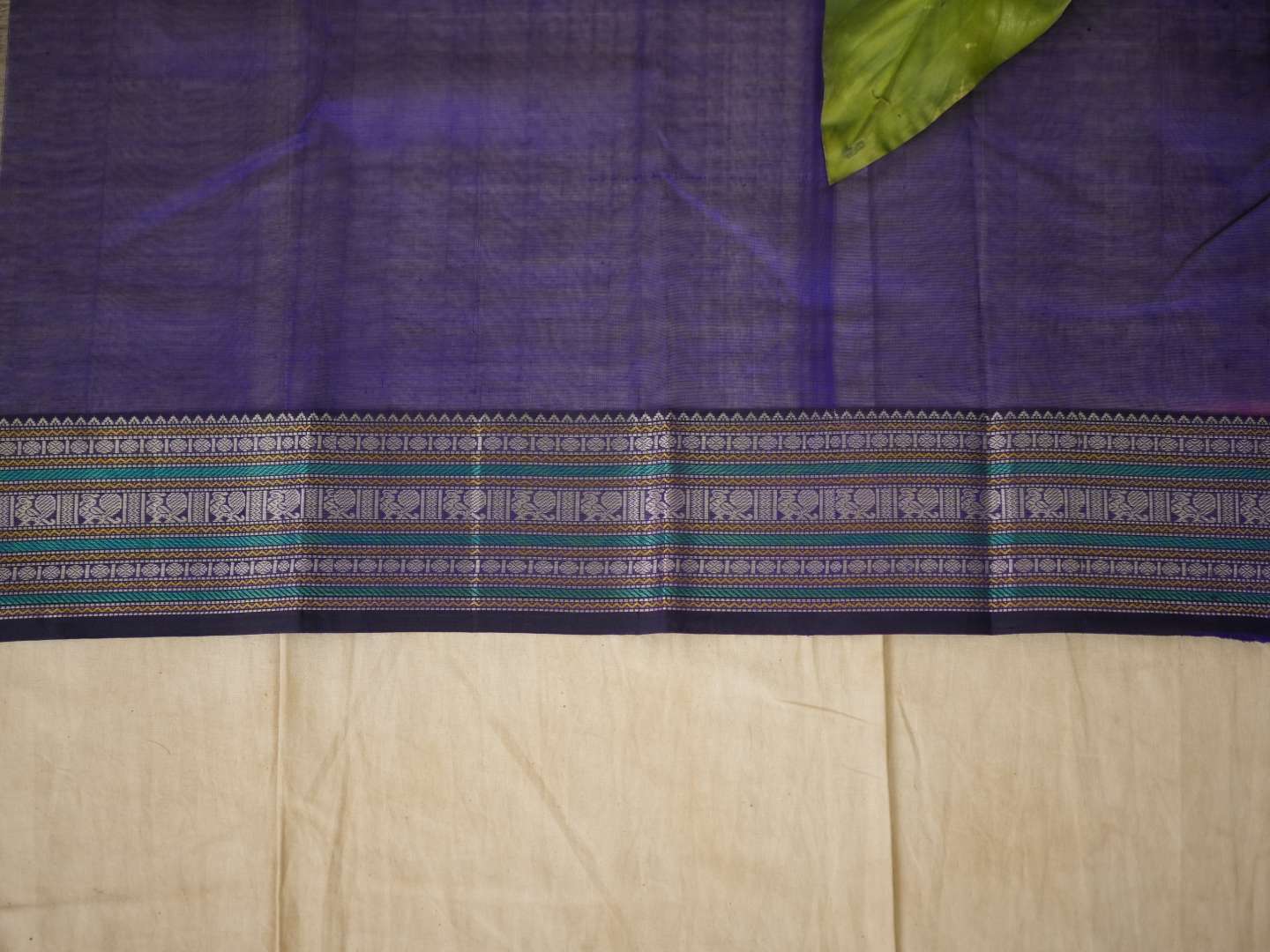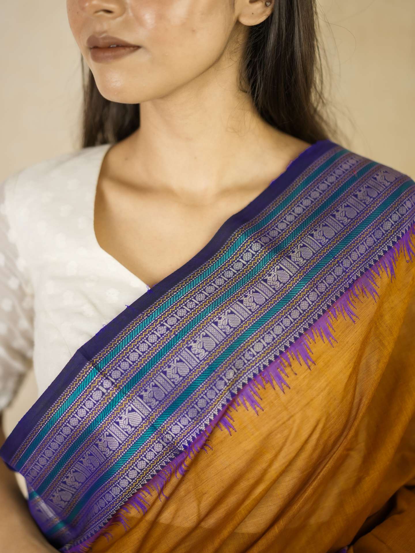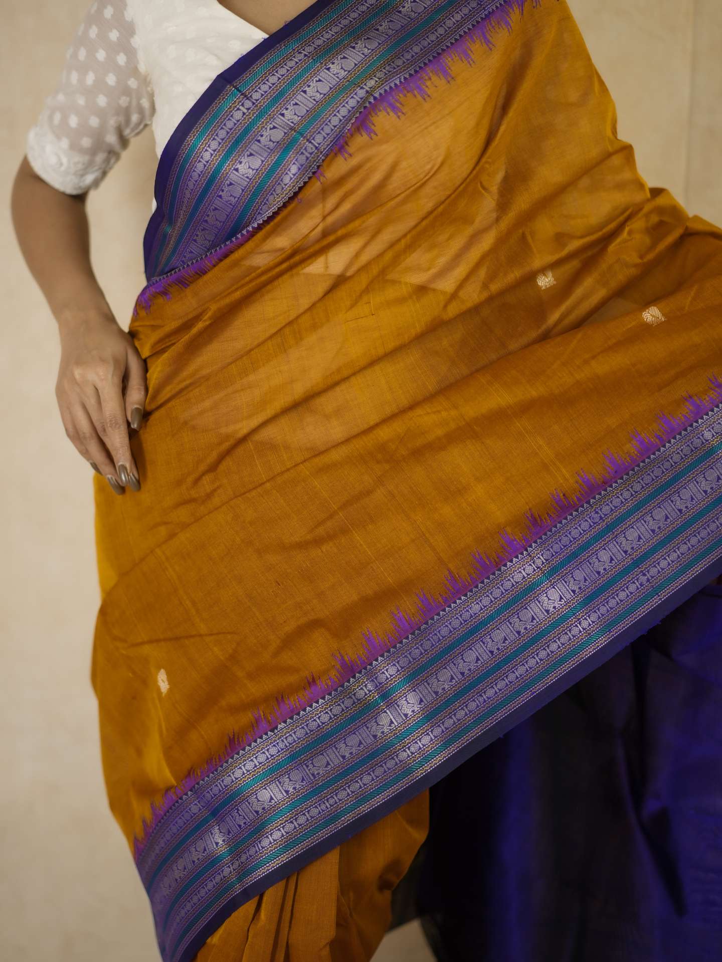 | Introducing our graceful Kanchi sico saree in a rich mustard cotton body highlighted with subtle green butta motifs and a regal purple silk border. The border is detailed with fine silver thread work, while the pallu features striking silver and golden woven peacock motifs, adding a majestic and elegant finish. |