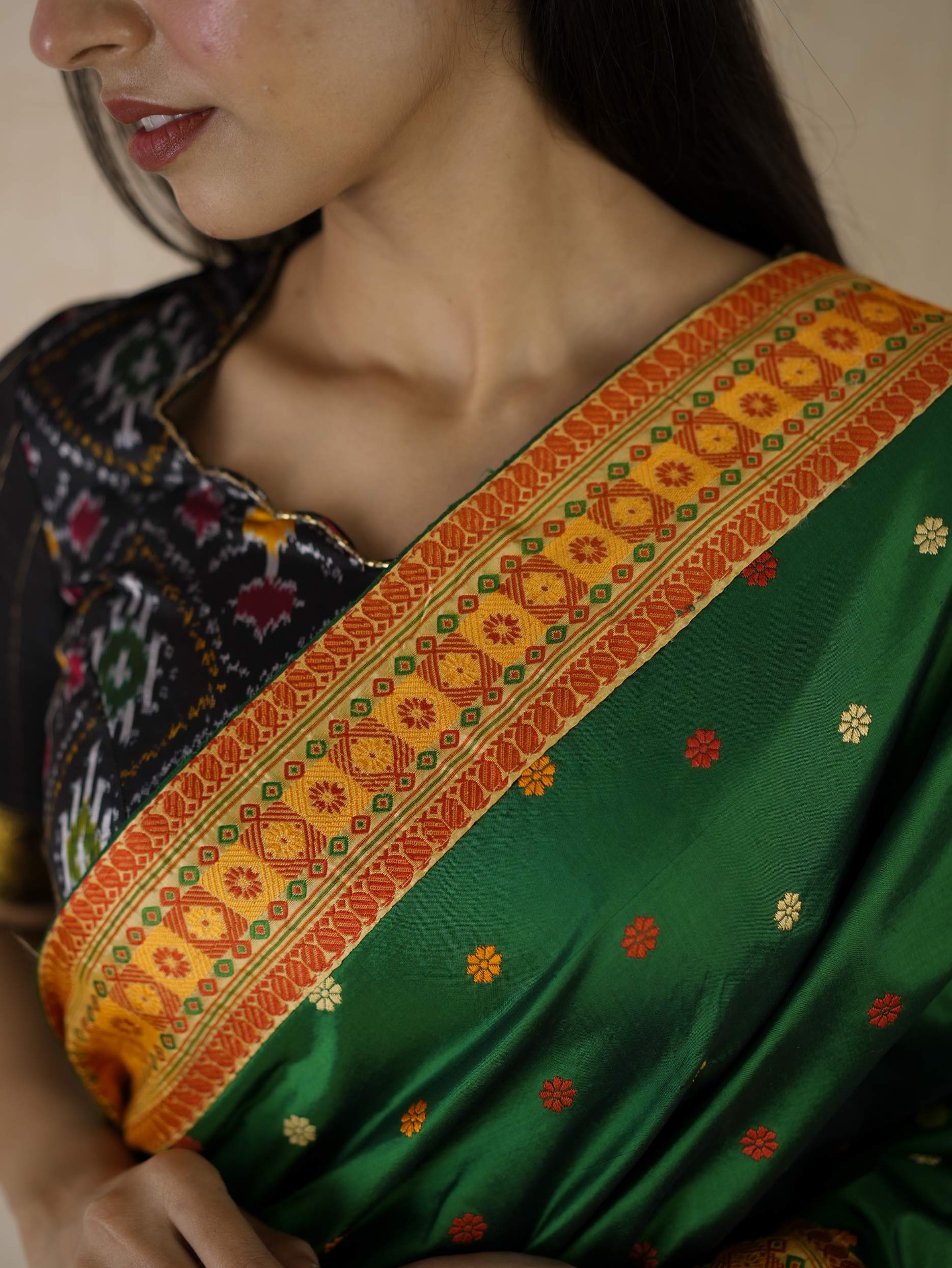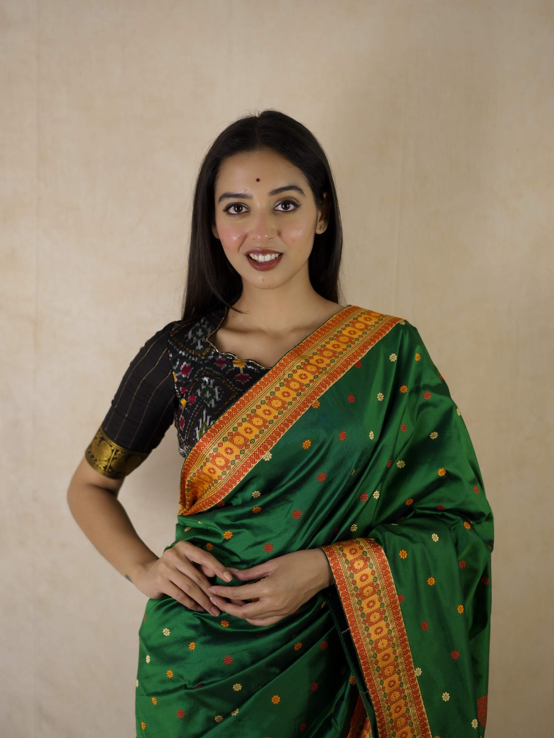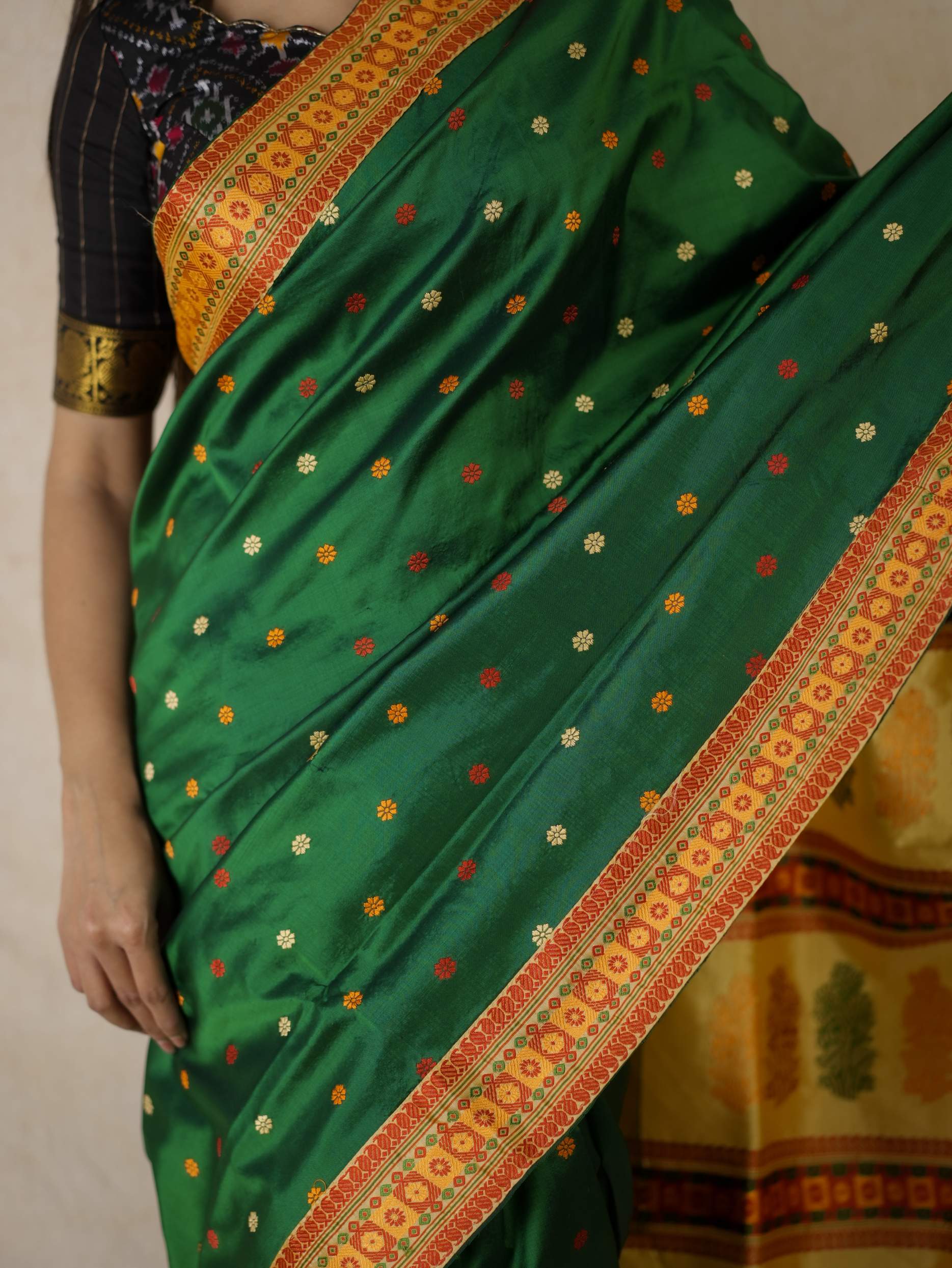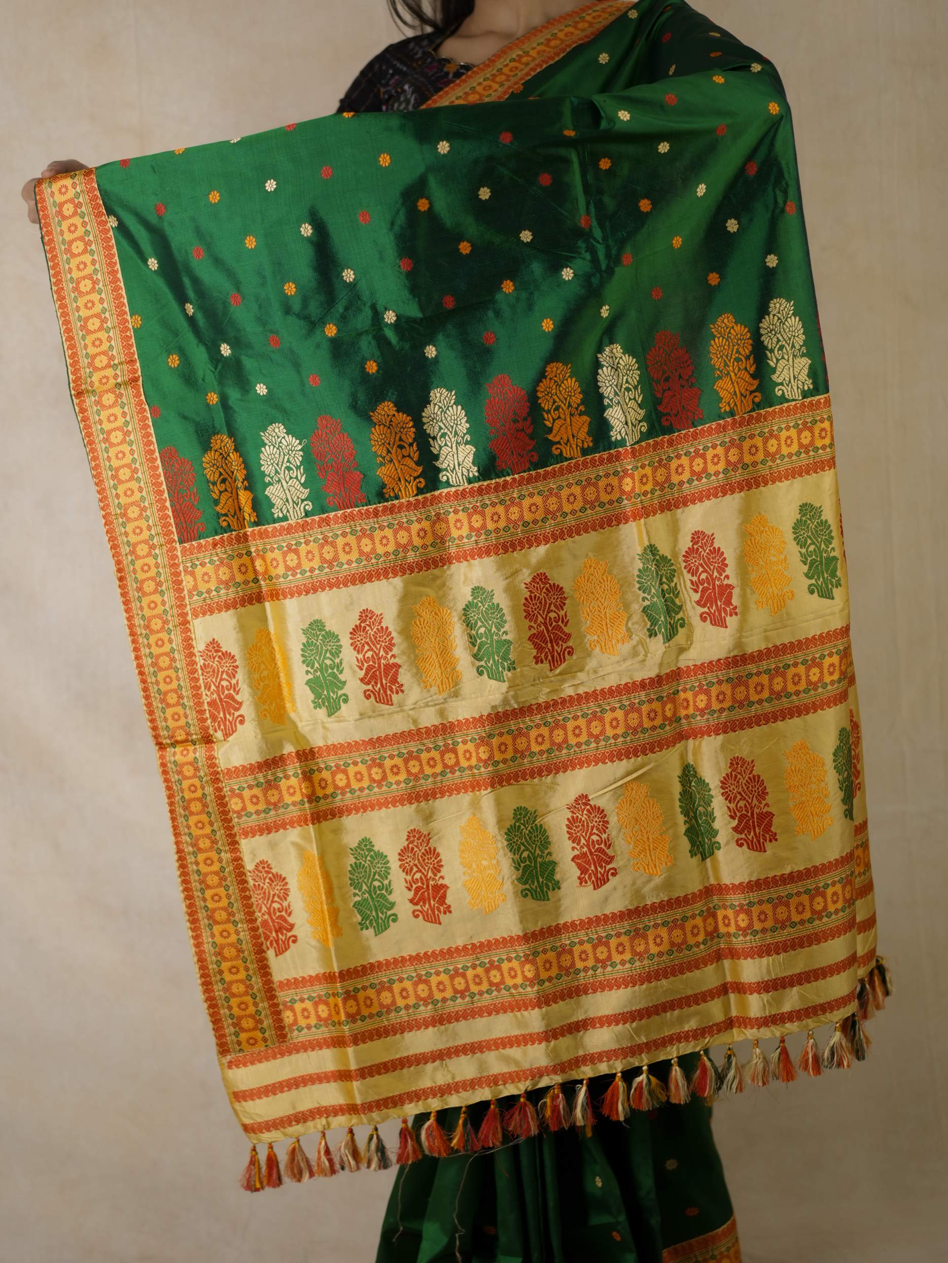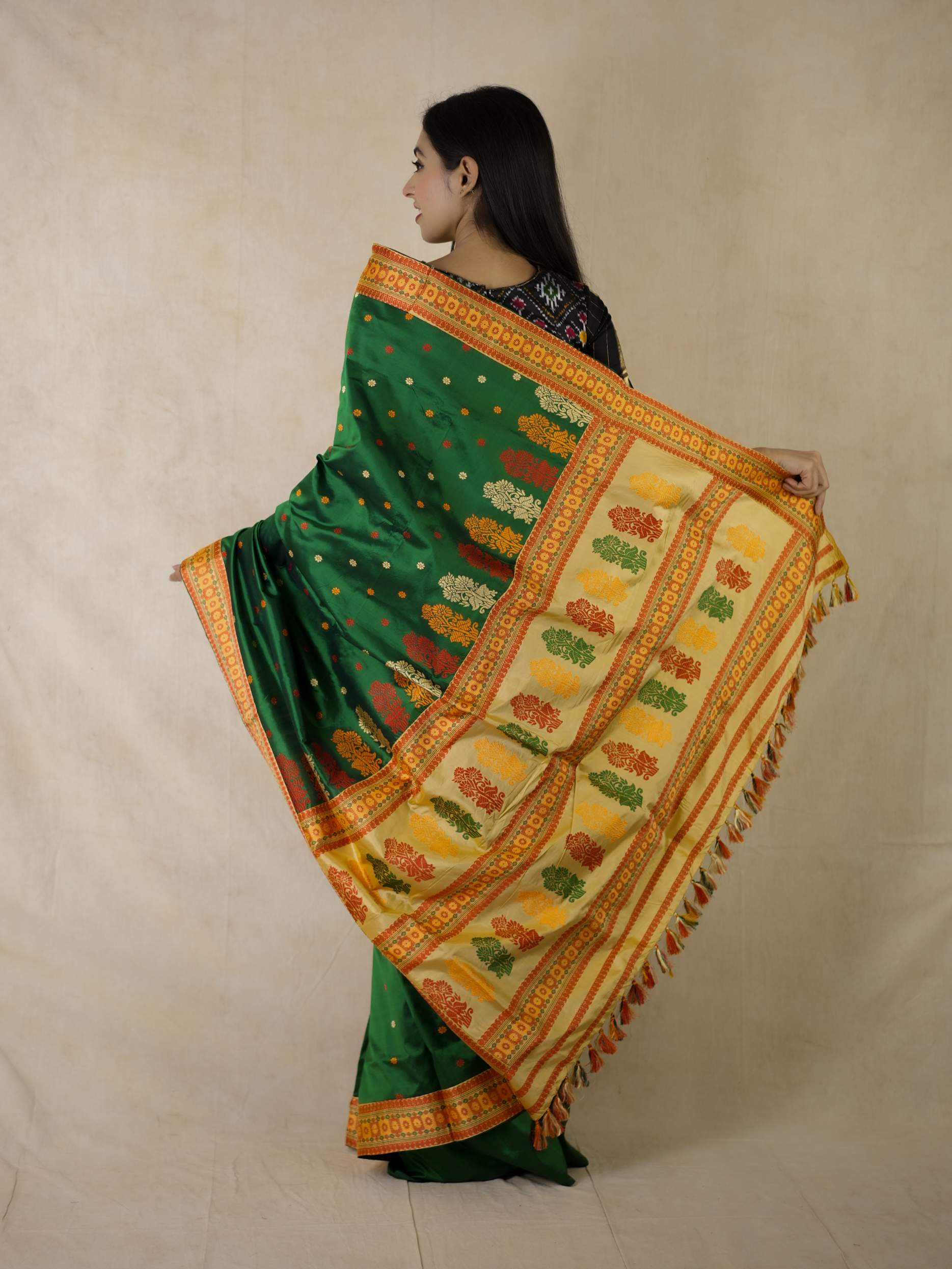 Woven with tradition and craftsmanship, this exquisite Assam saree in green is a tribute to the region’s rich textile heritage. Crafted from pure pat silk (mulberry silk), it embodies the artistry that Assam’s weavers have perfected over generations.Add this timeless masterpiece to your collection — a true reflection of Assam’s enduring artistry