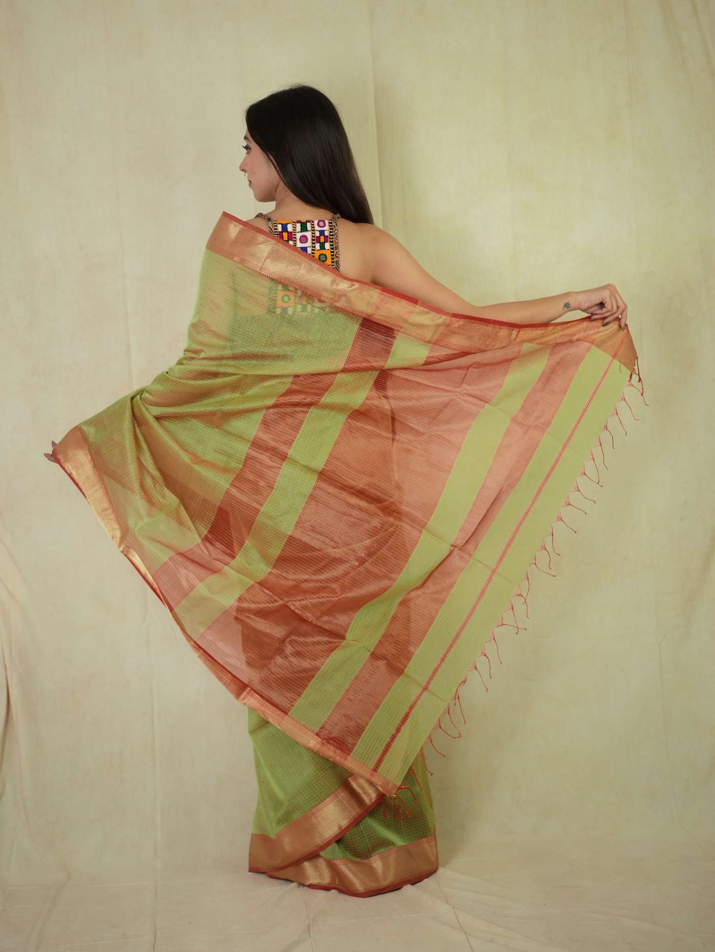 Elevate your ethnic wardrobe with our greenish beige Maheshwari sico saree, featuring subtle checks all across the body ,a classic golden zari border with light red edging, and a striking striped golden-red zari palla. This saree blends traditional artistry with modern elegance, making it an ideal choice for festive gatherings and special occasions.