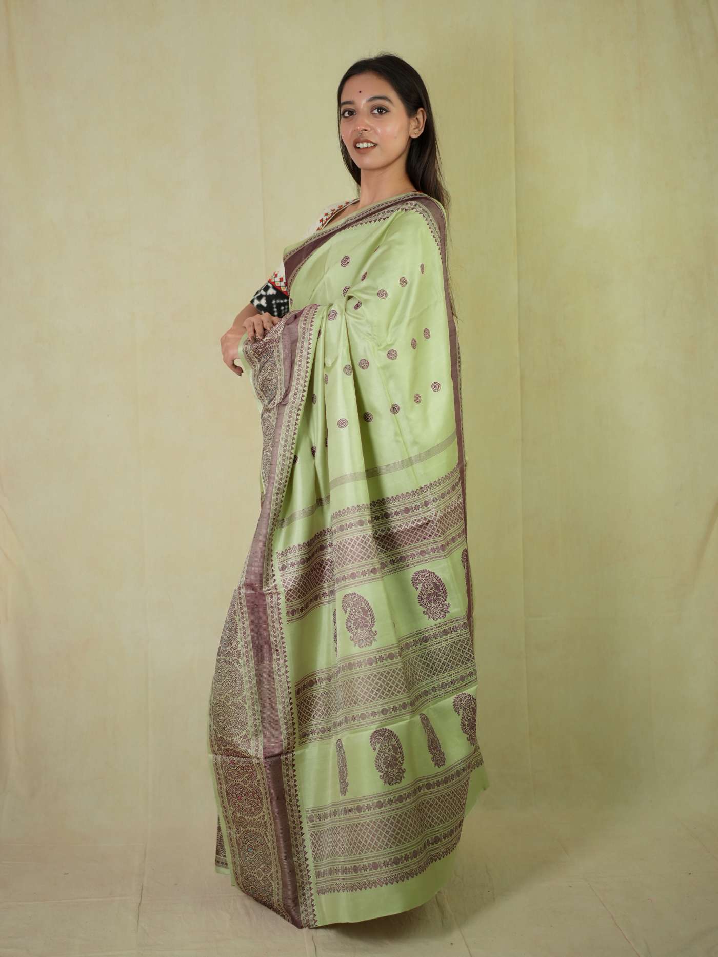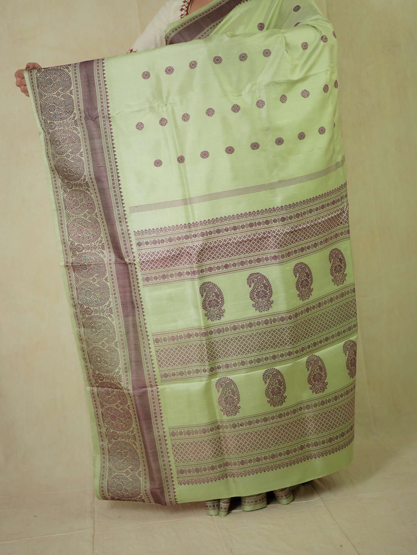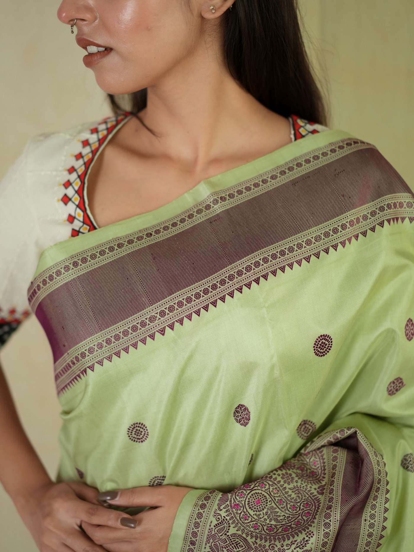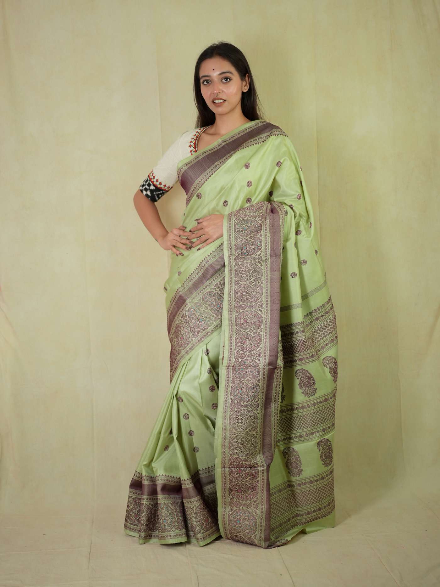 Indulge in the timeless beauty of light mint green colour silk Gadwal saree, a graceful blend of tradition and elegance. Handwoven with pure mulberry silk, it features delicate buttas all across the body,enhanced by a vibrant dark brown thread work border. Perfect for weddings, festive occasions, and cultural celebrations.