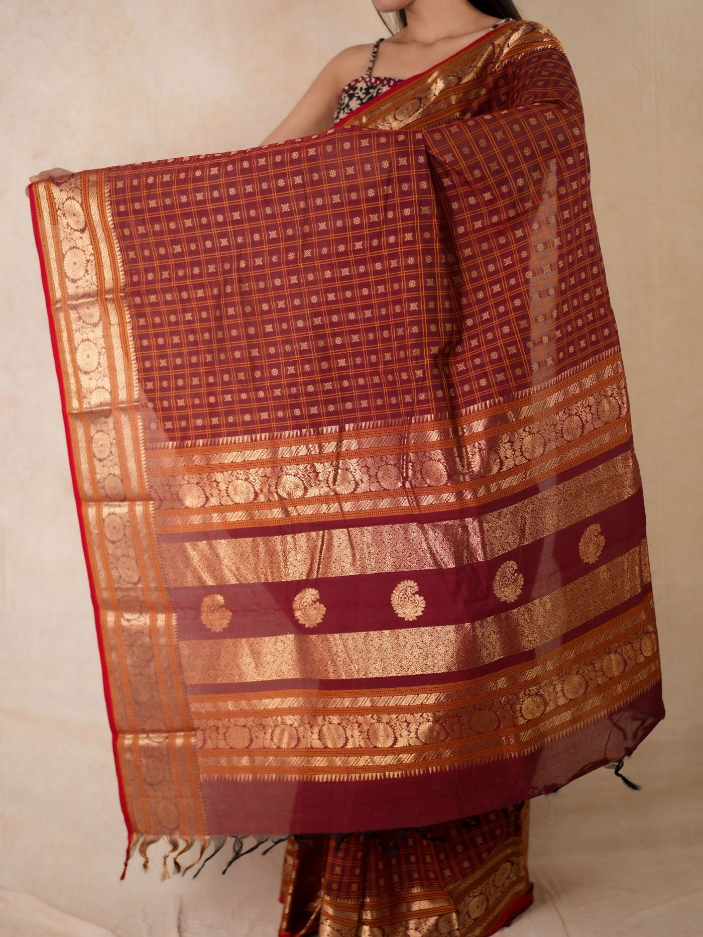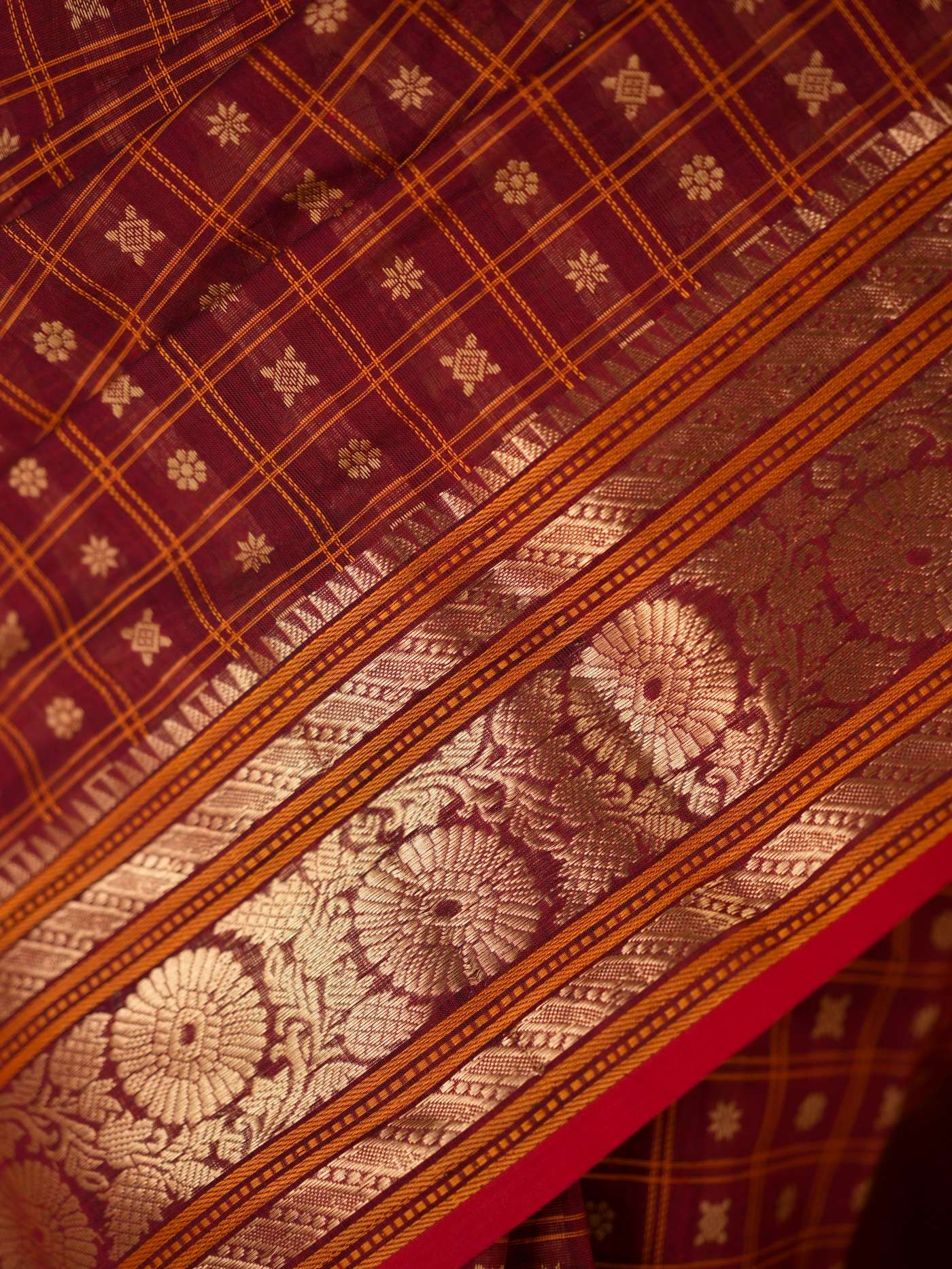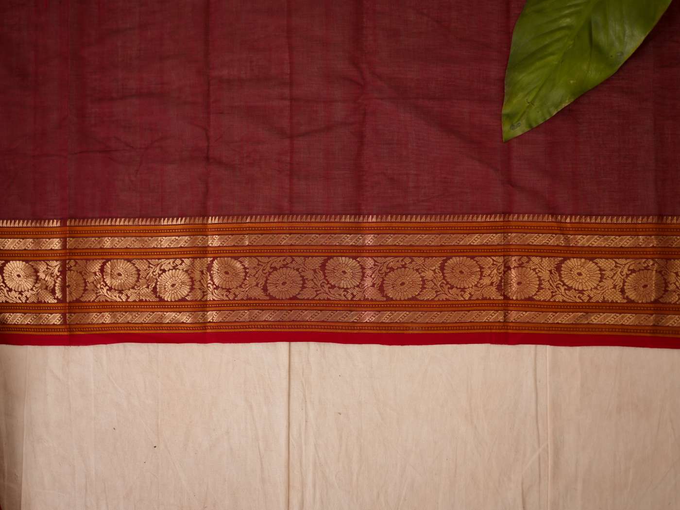 Enhance your ethnic ensemble with our maroon Kanchipuram cotton saree, featuring intricate small floral butis all across with a striking and traditional zari work border. Perfect for any special occasion, this saree combines traditional artistry with modern elegance.