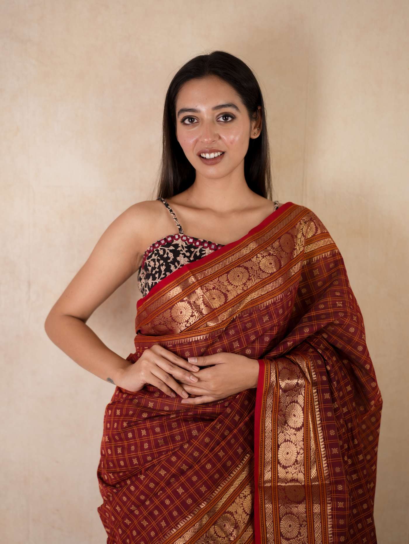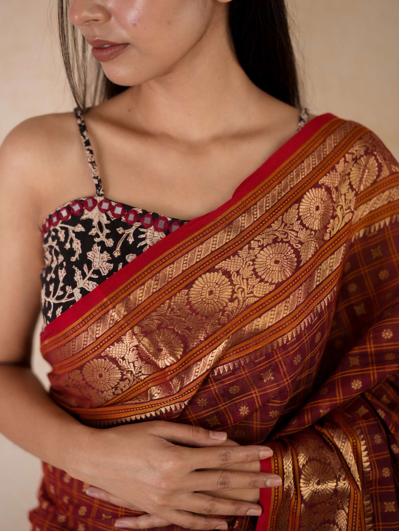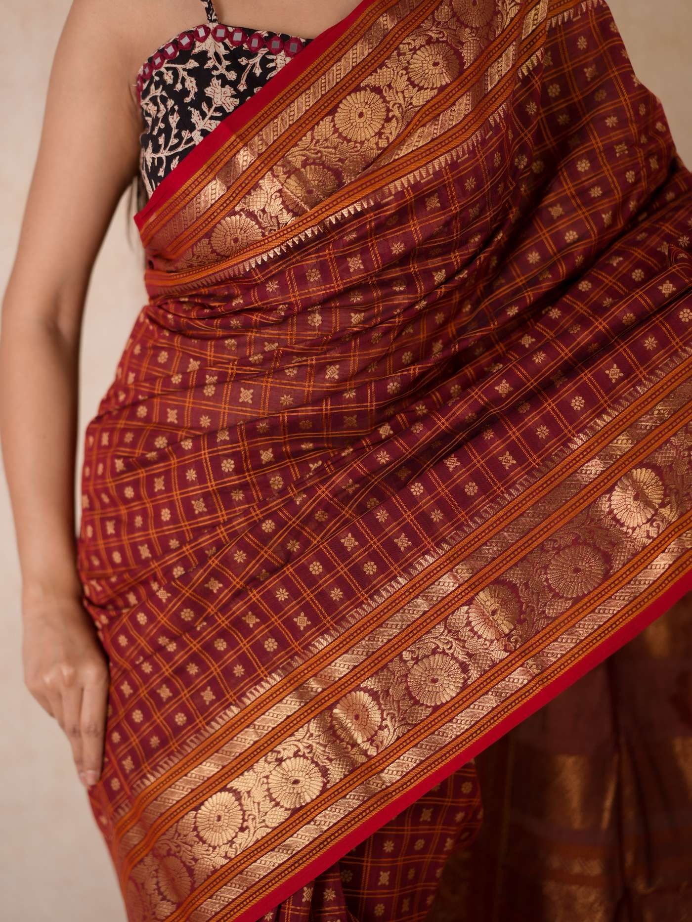 Enhance your ethnic ensemble with our maroon Kanchipuram cotton saree, featuring intricate small floral butis all across with a striking and traditional zari work border. Perfect for any special occasion, this saree combines traditional artistry with modern elegance.