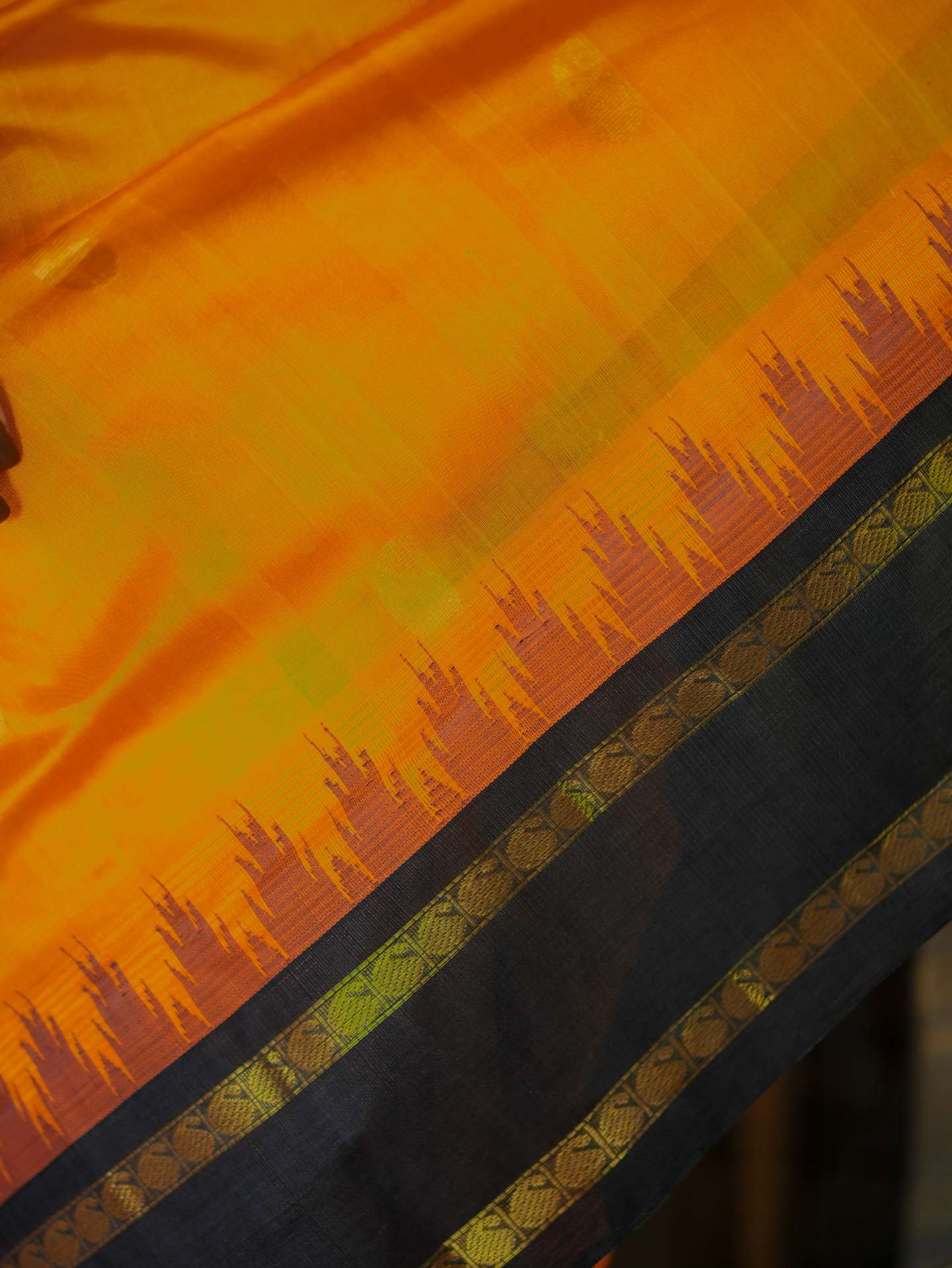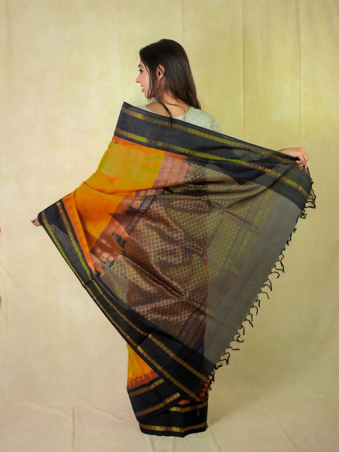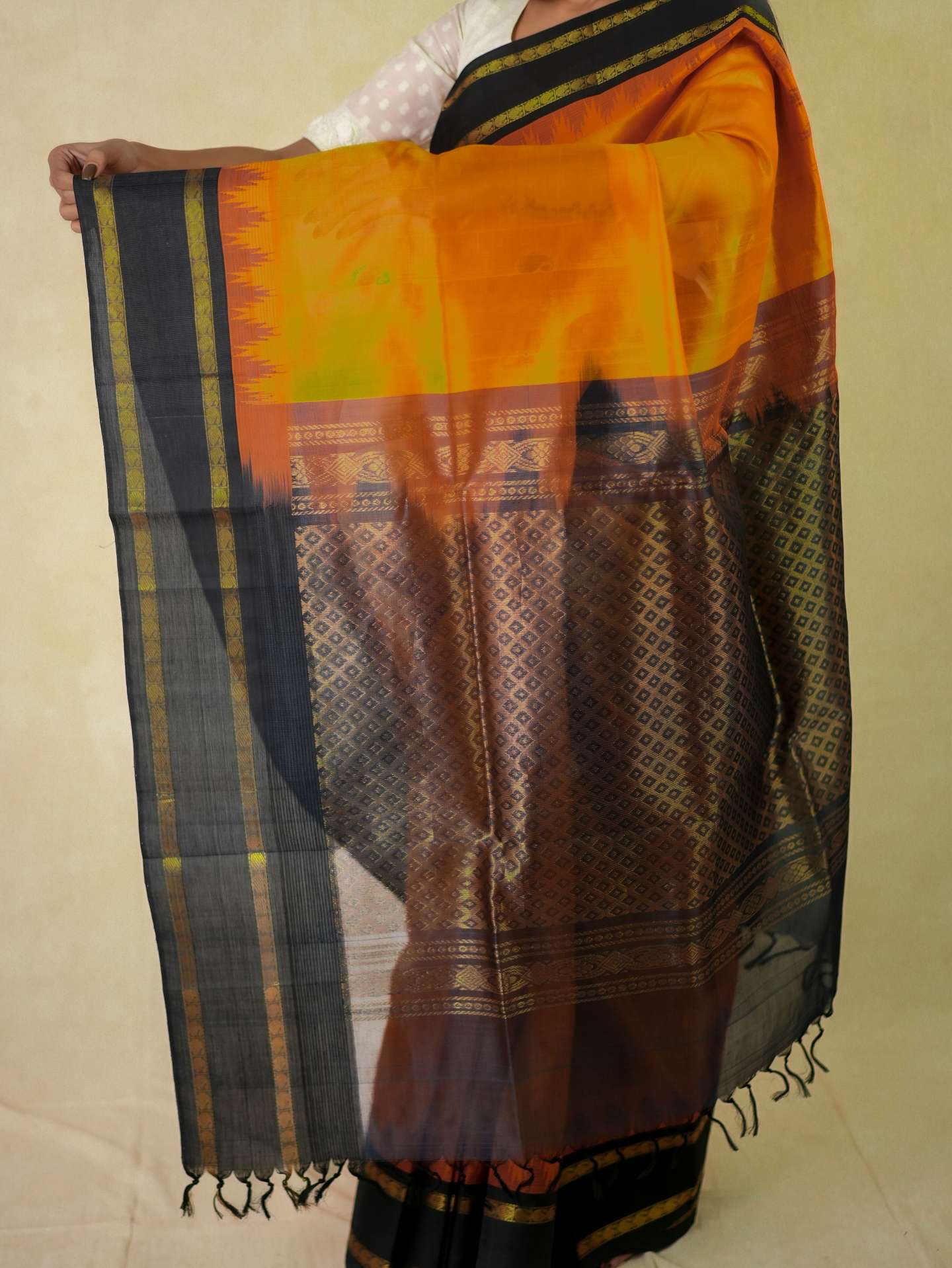 Introducing our striking orange and black Kanchipuram sico saree adorned with delicate golden buttas across the body, highlighted by rich golden zari work. The saree features an elegant black border with golden zari detailing, while the pallu is beautifully embellished with traditional golden zari motifs, enhancing its regal charm.
