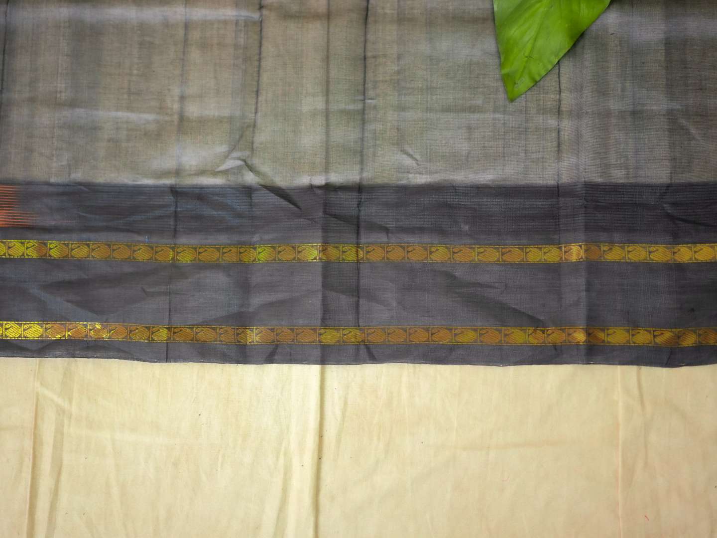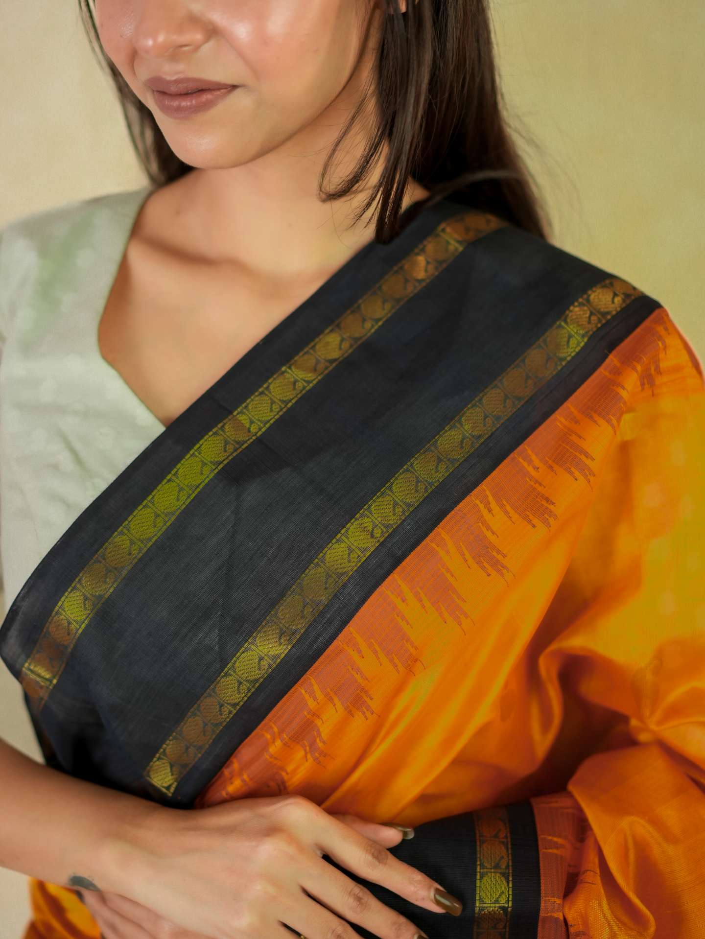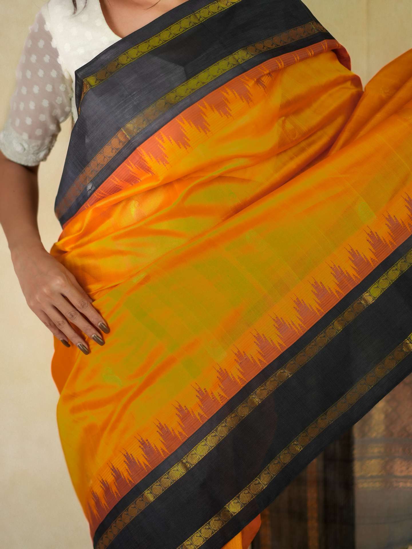 Introducing our striking orange and black Kanchipuram sico saree adorned with delicate golden buttas across the body, highlighted by rich golden zari work. The saree features an elegant black border with golden zari detailing, while the pallu is beautifully embellished with traditional golden zari motifs, enhancing its regal charm.