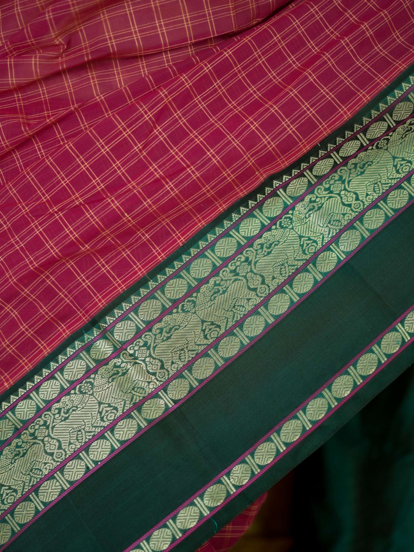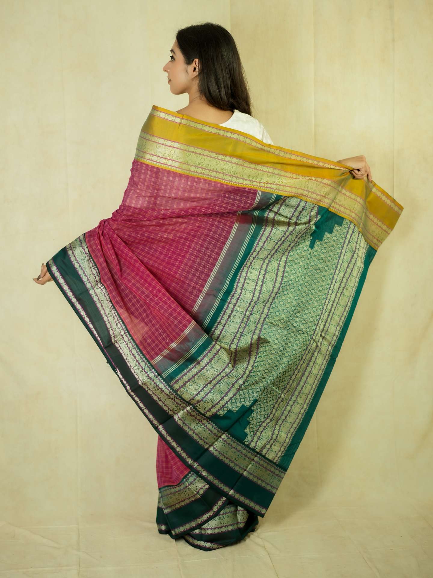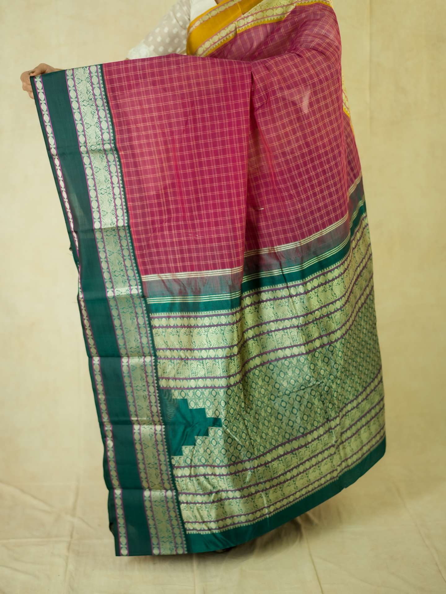 Introducing our graceful Kanchi sico saree in a rich rose-pink cotton checked body paired with a lustrous silk border. Accented with elegant green and golden borders highlighted by fine silver thread work, the pallu features detailed silver woven motifs on a deep green base, creating a refined and timeless appeal.