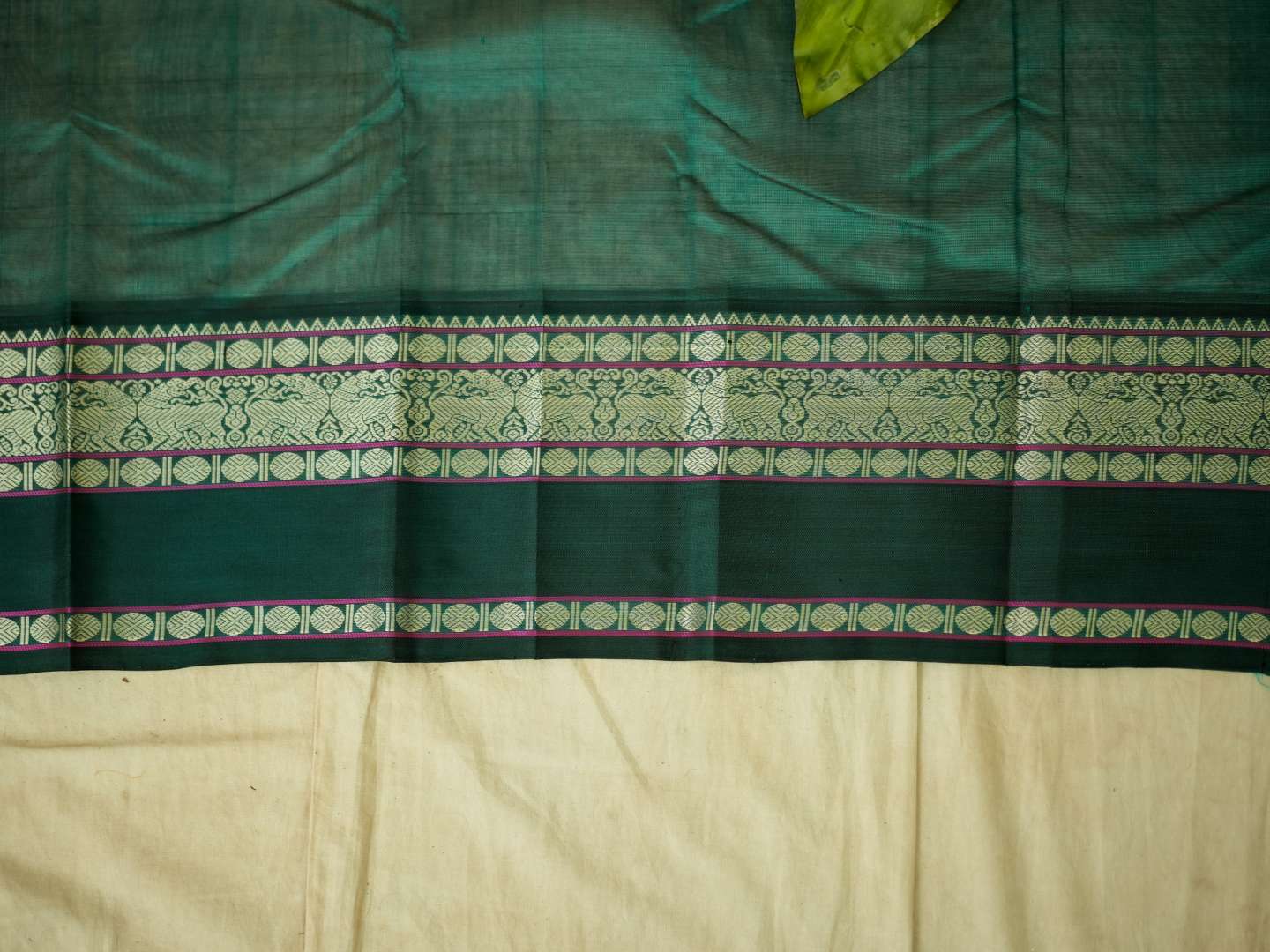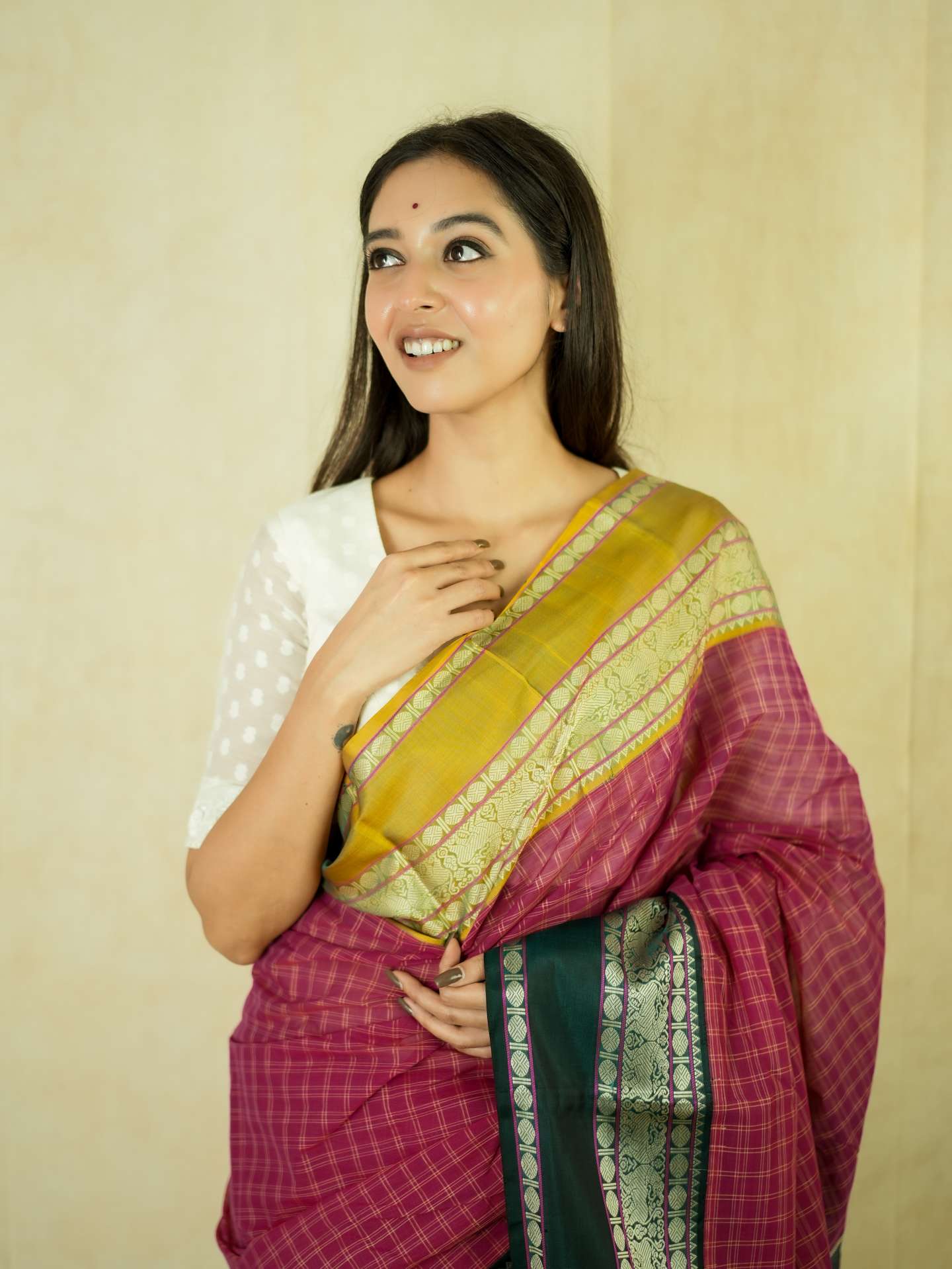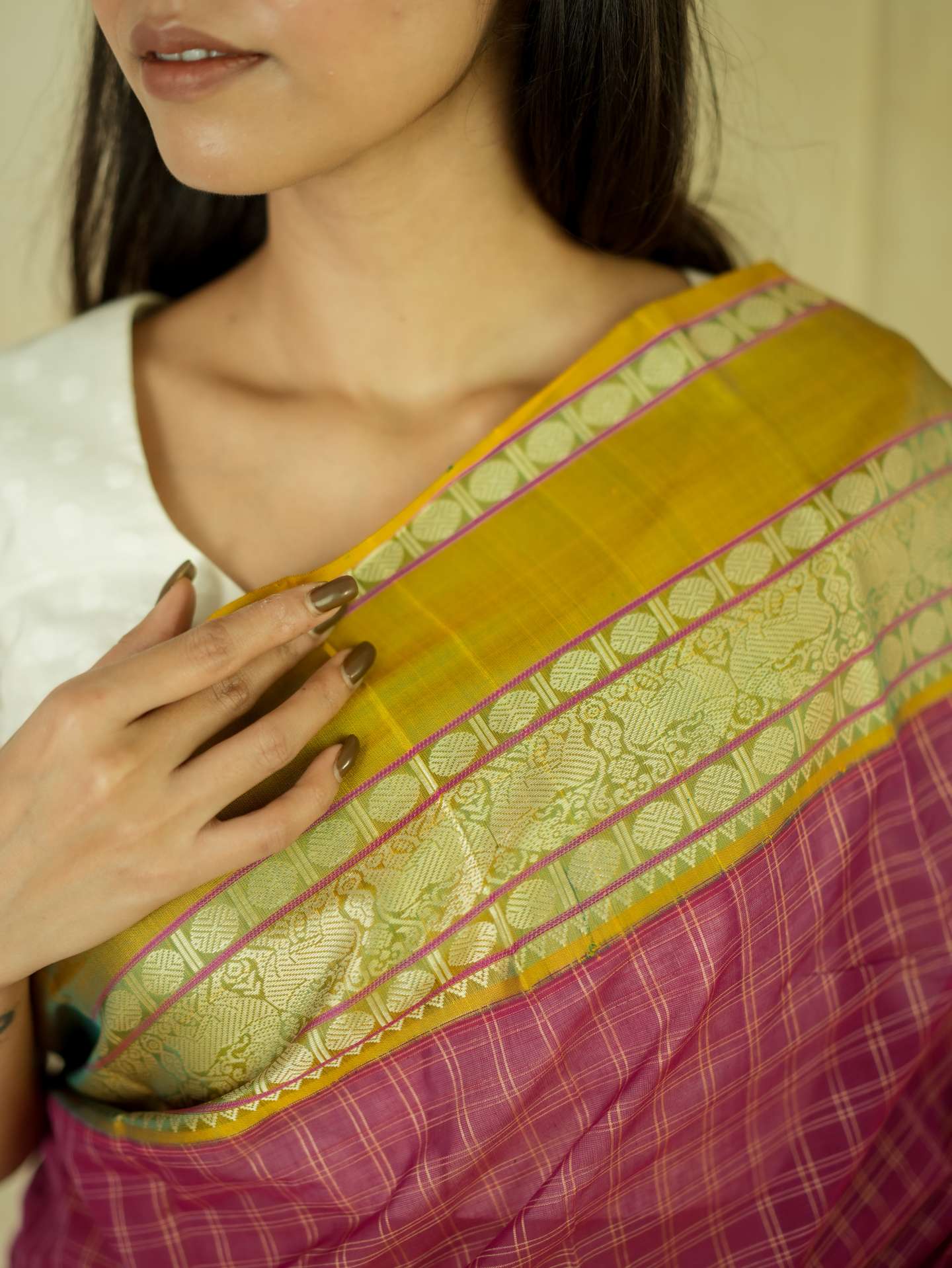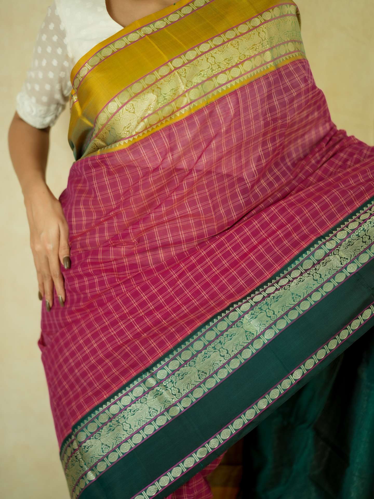 Introducing our graceful Kanchi sico saree in a rich rose-pink cotton checked body paired with a lustrous silk border. Accented with elegant green and golden borders highlighted by fine silver thread work, the pallu features detailed silver woven motifs on a deep green base, creating a refined and timeless appeal.