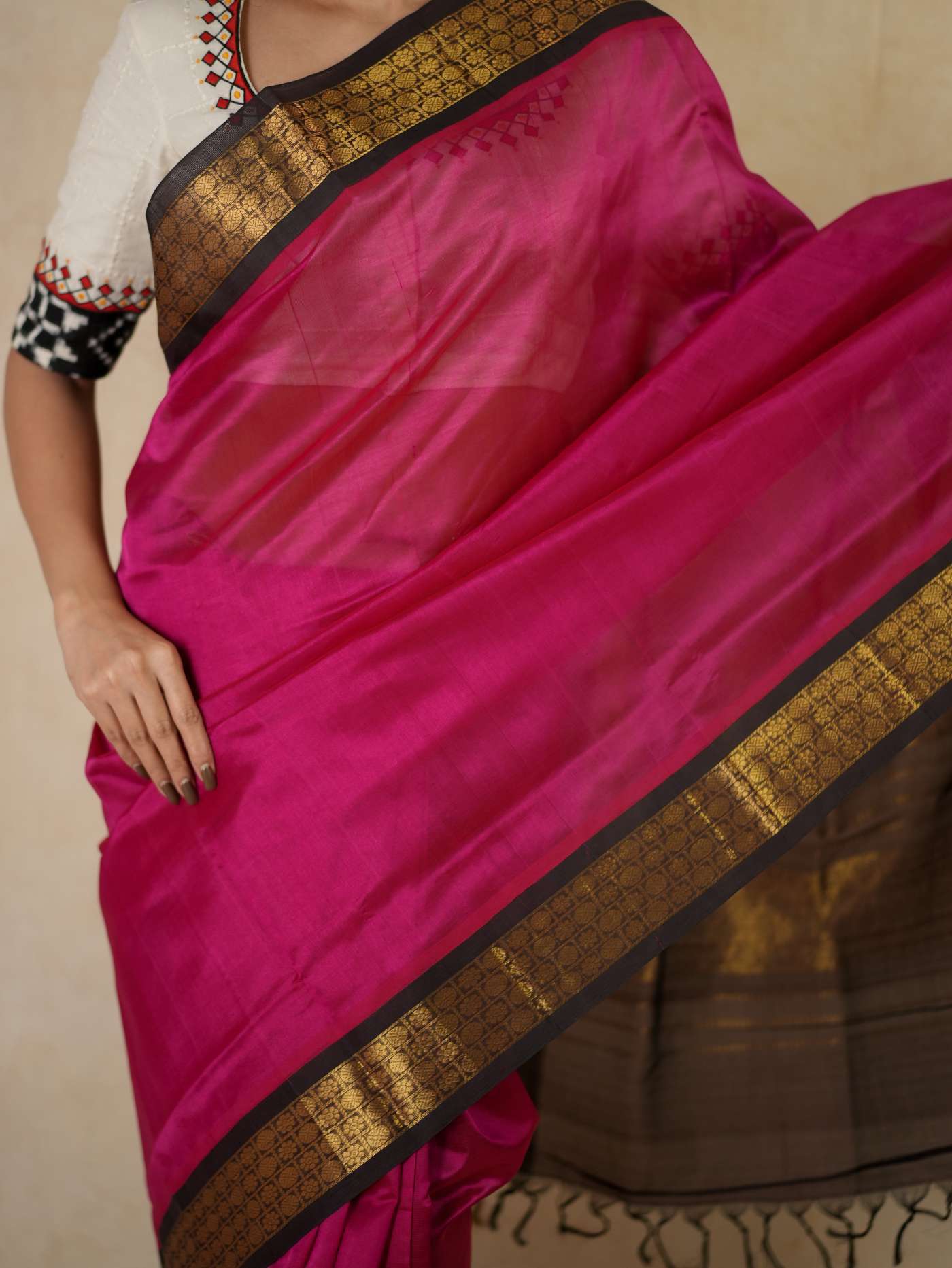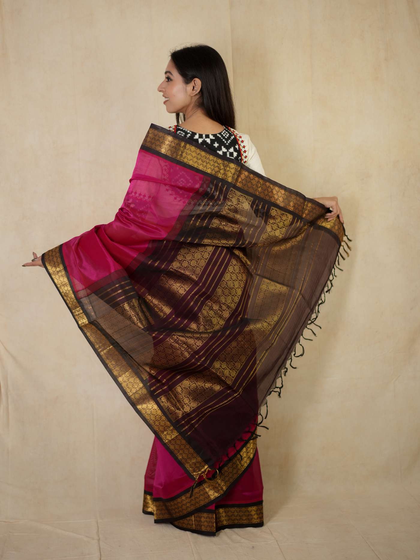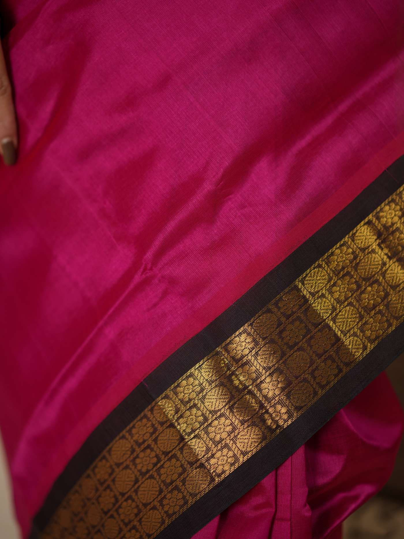 Introducing our graceful pink Kanchipuram sico saree featuring a refined plain body that highlights its rich texture. The saree is accentuated with a deep maroon border adorned with intricate golden zari work, while the pallu showcases traditional golden zari motifs, creating a regal contrast and timeless elegance.