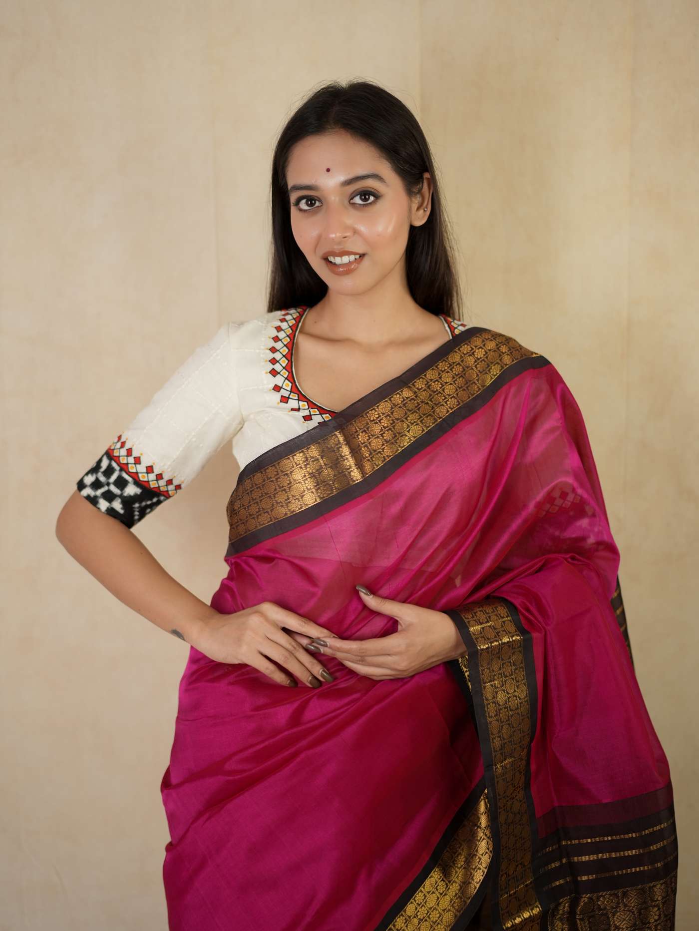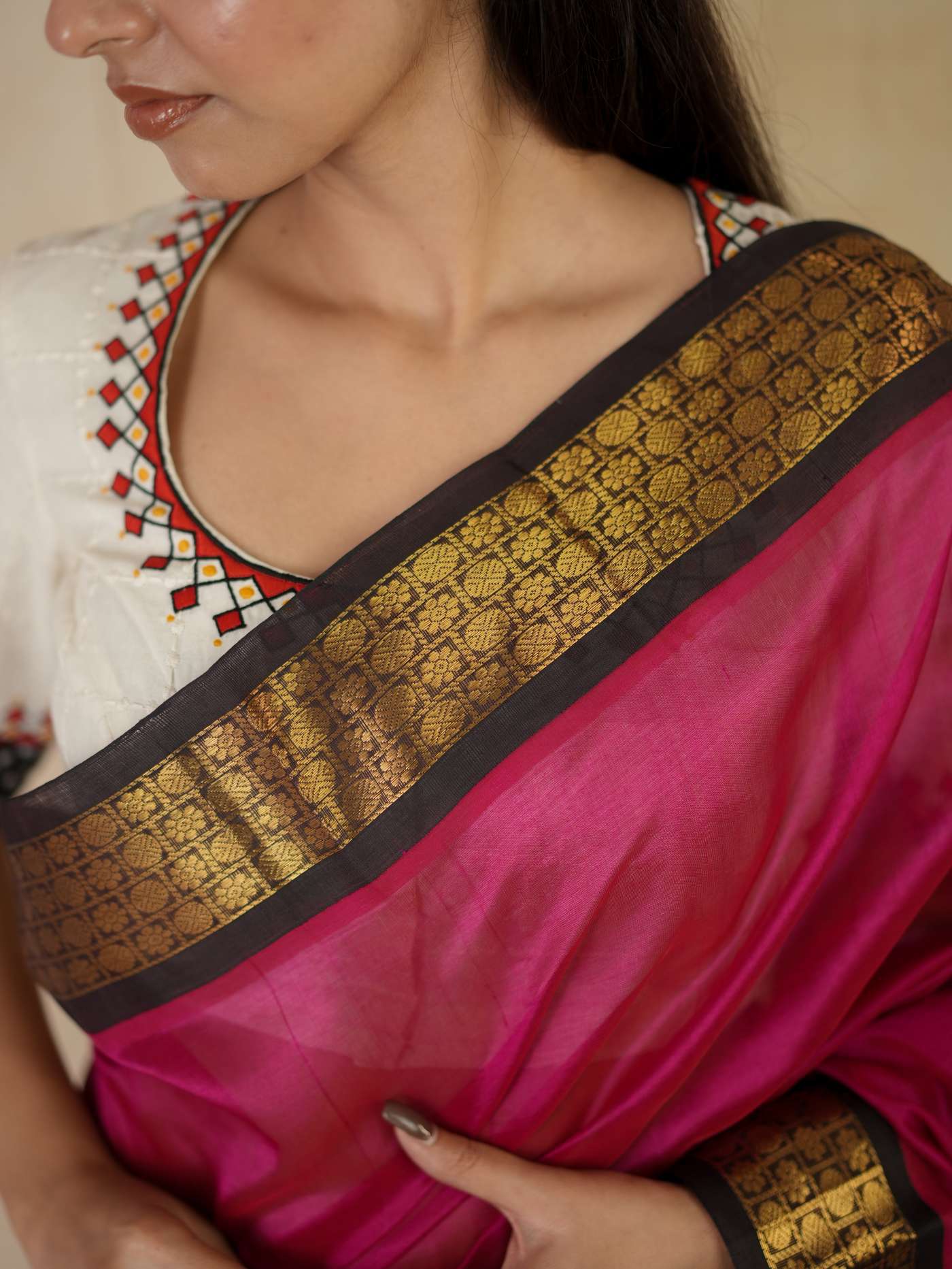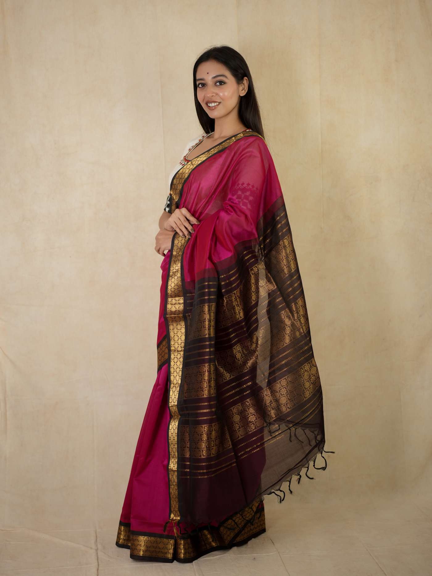 Introducing our graceful pink Kanchipuram sico saree featuring a refined plain body that highlights its rich texture. The saree is accentuated with a deep maroon border adorned with intricate golden zari work, while the pallu showcases traditional golden zari motifs, creating a regal contrast and timeless elegance.