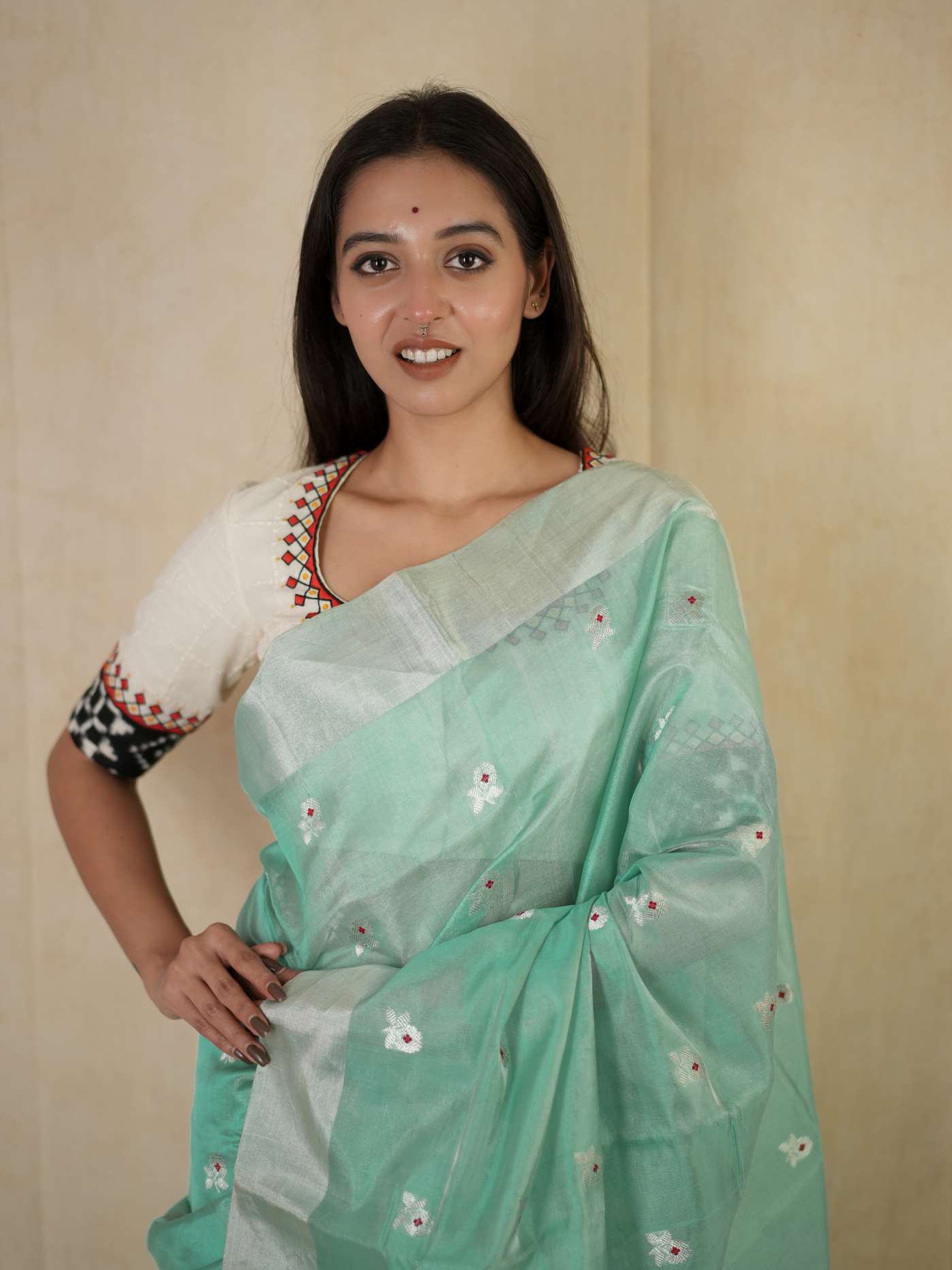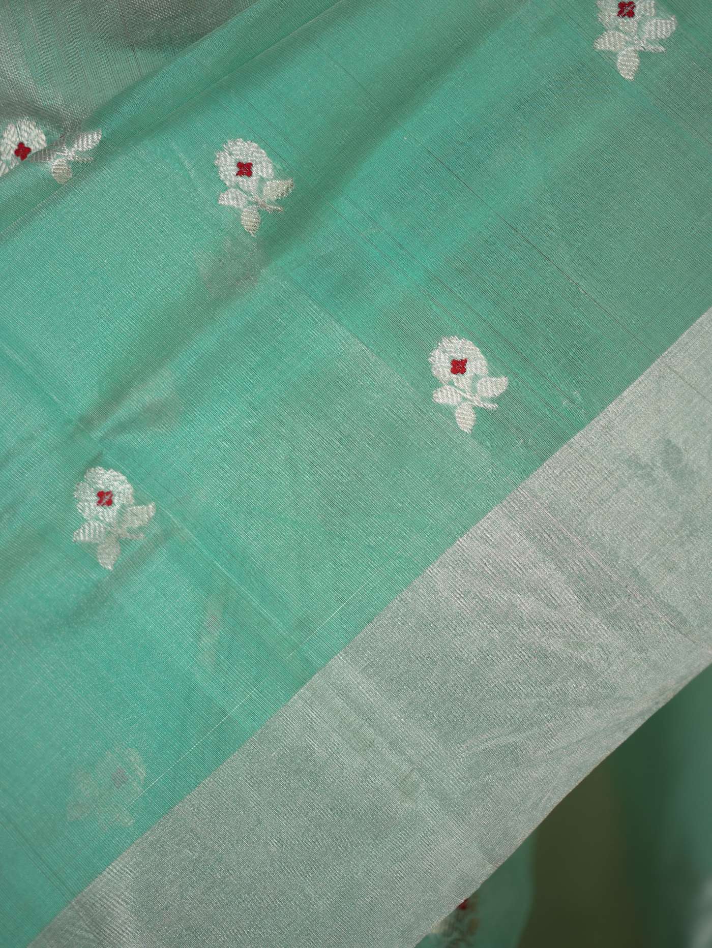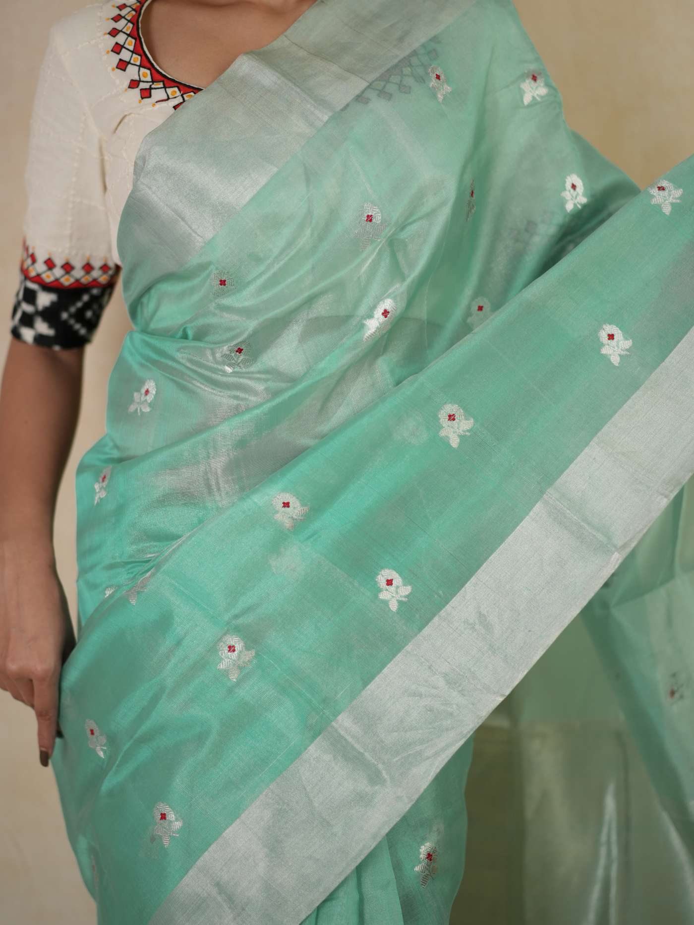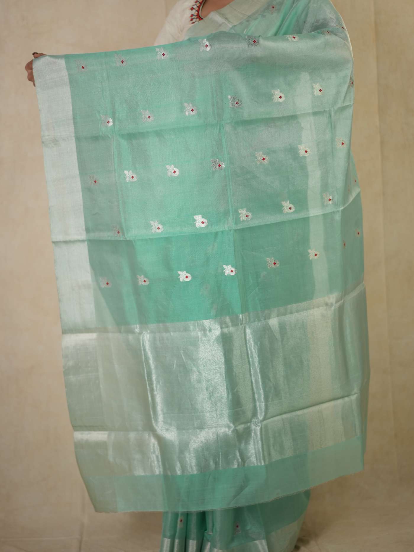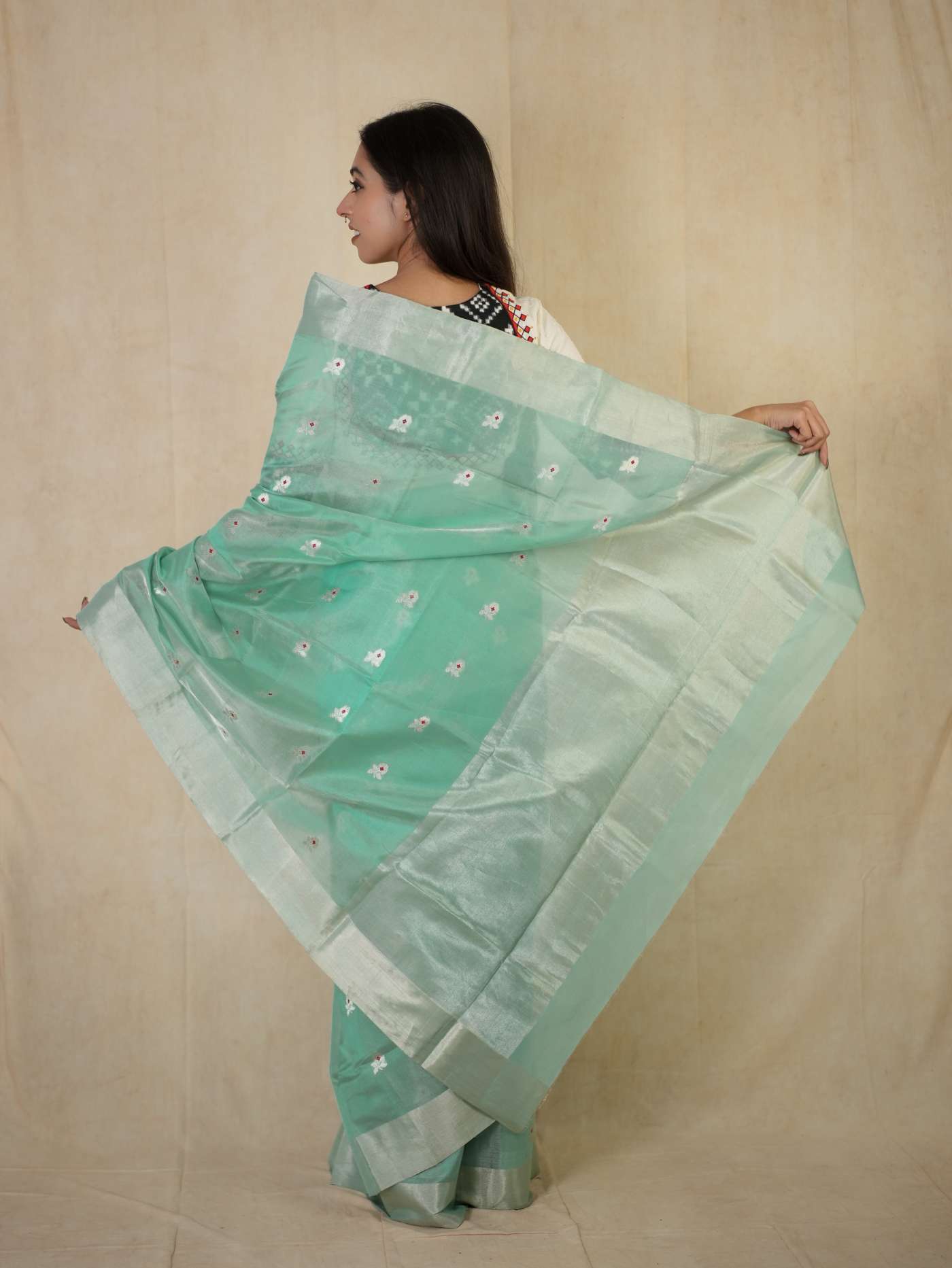 This Chanderi sea green silk tissue saree embodies elegance and charm, with delicate floral motifs that enhance its timeless appeal. Perfect for festive occasions, weddings, or celebrations, this saree radiates sophistication and grace, making you shine with effortless beauty and regal poise.