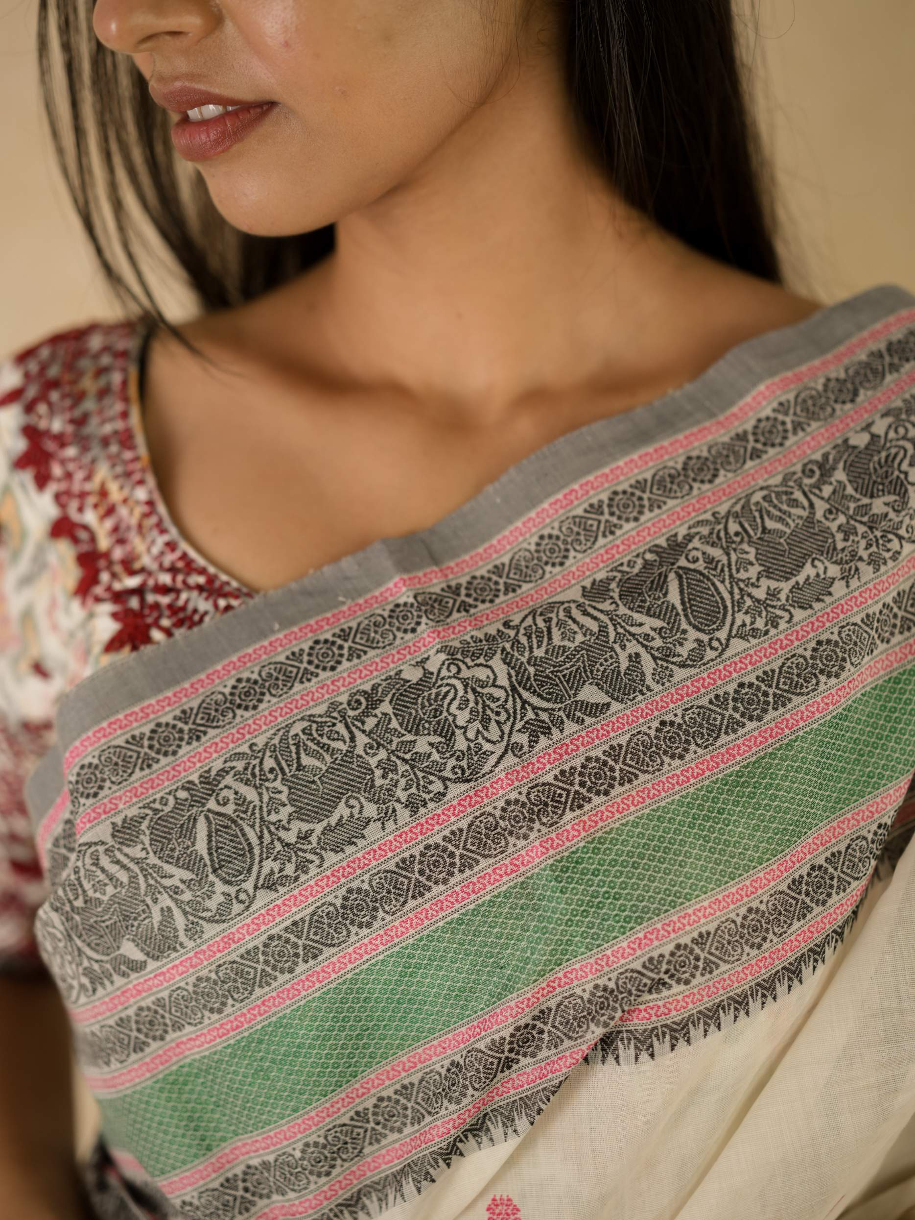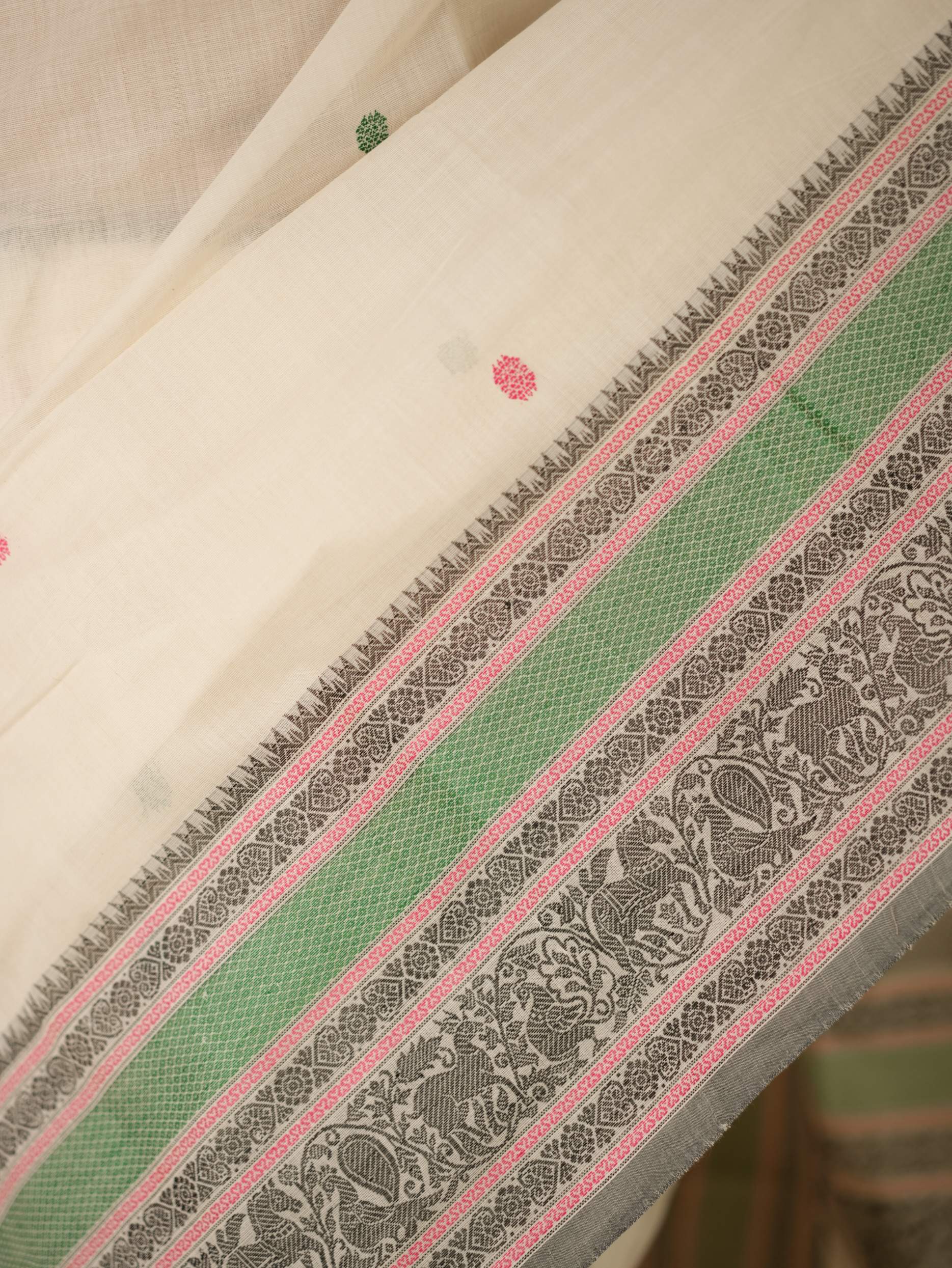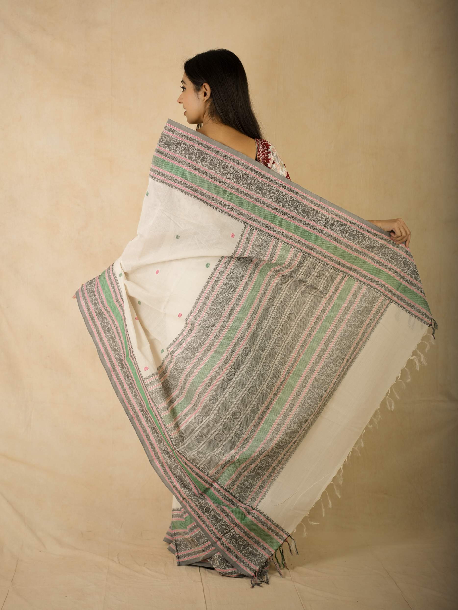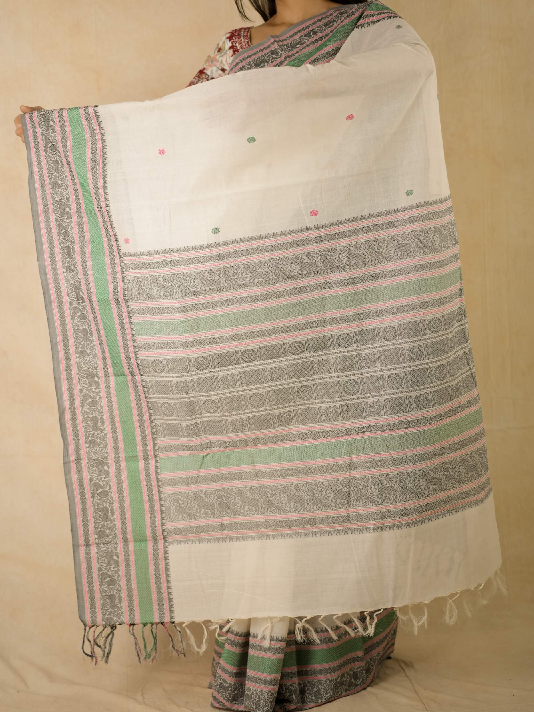 Enhance your ethnic ensemble with ourwhite Kanchipuram cotton saree, featuring intricate small buties, a striking and traditional wide border, and a sophisticated grey colour selvedge . Perfect for any special occasion, this saree combines traditional artistry with modern elegance.