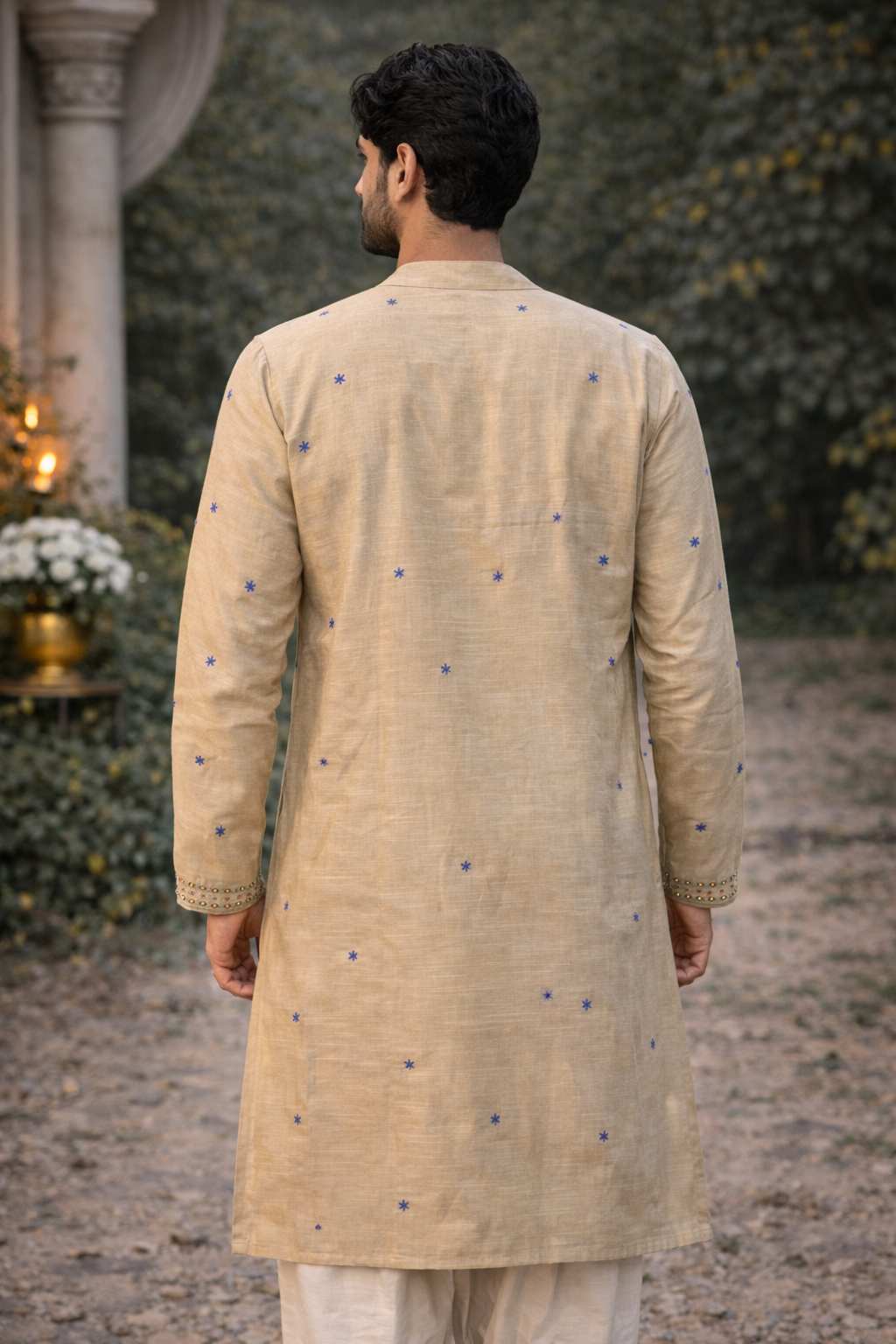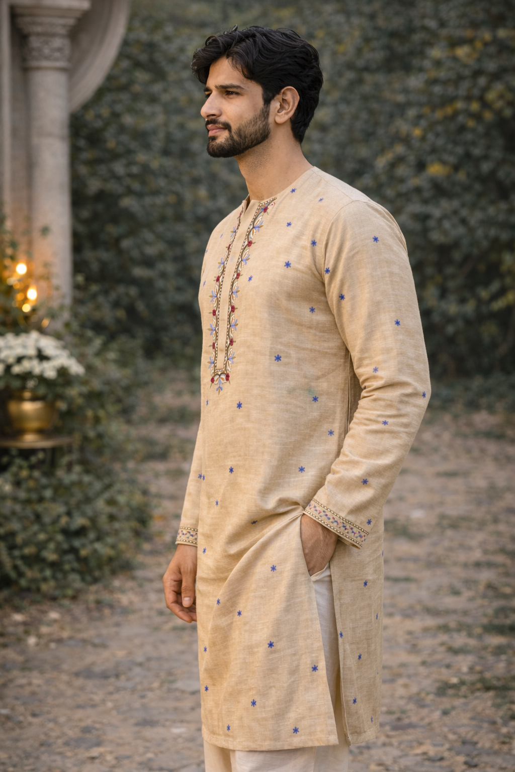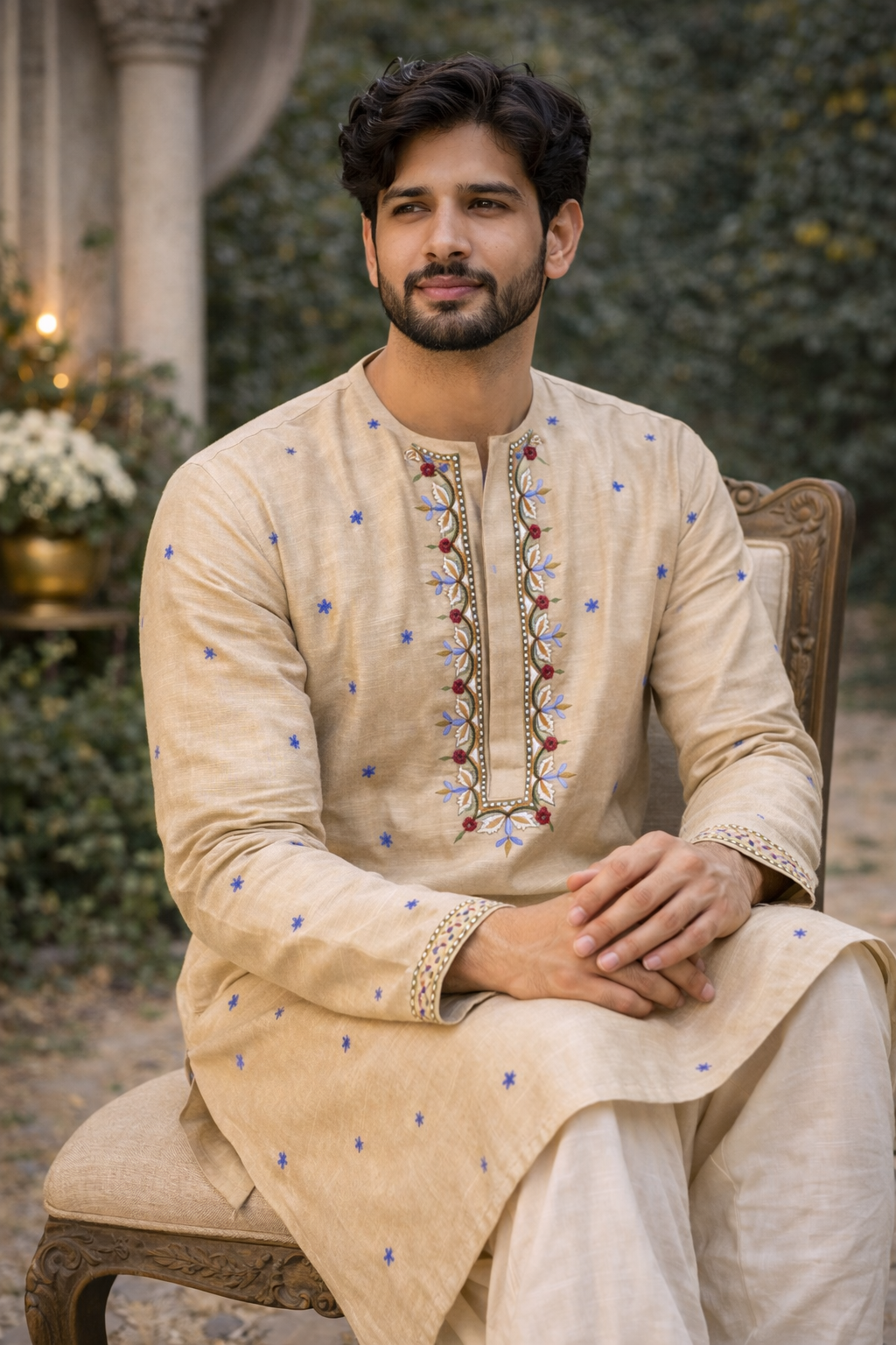Step up your ethnic game with this beige silk blend kurta for men. The soft beige base is beautifully detailed with multicolour floral embroidery along the neckline and placket, adding refined elegance and festive charm. Pair it with churidar or straight pants and classic mojaris for a polished, royal, and sophisticated look.