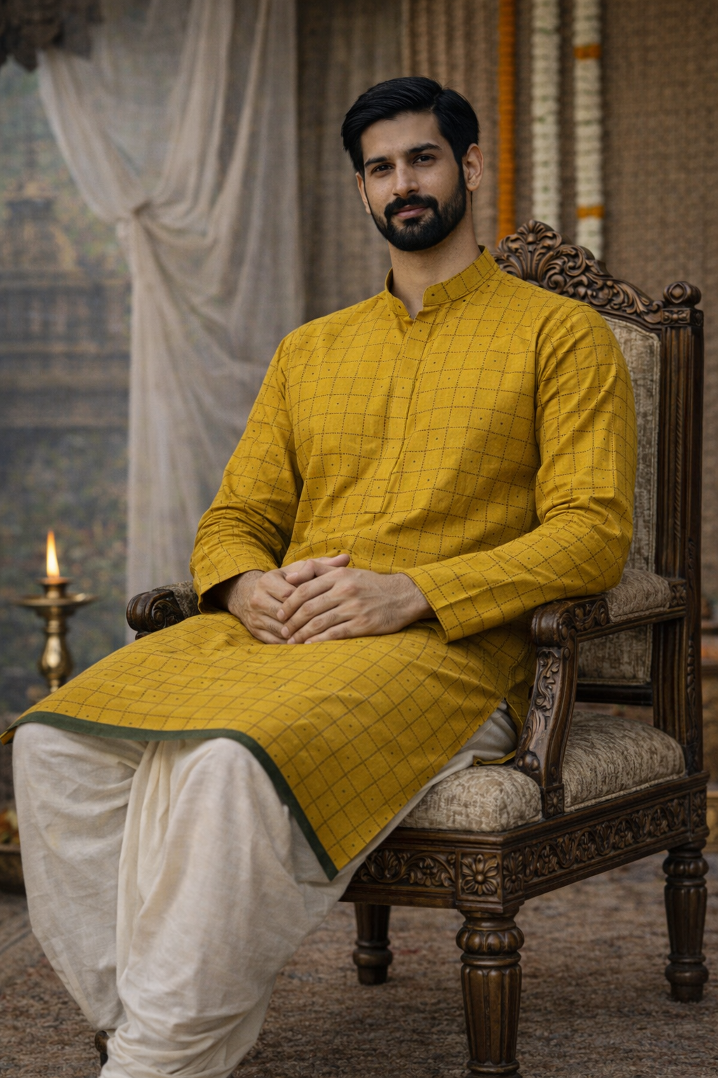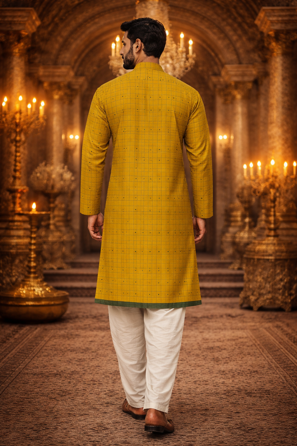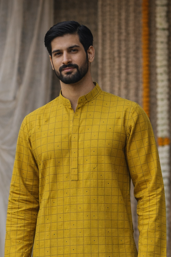 Step up your ethnic game with this mustard yellow cotton kurta for men. The vibrant festive hue is enhanced with a refined check pattern and minimal detailing, offering a perfect balance of tradition and modern style. Pair it with churidar or straight pants and classic mojaris for a polished, elegant look.