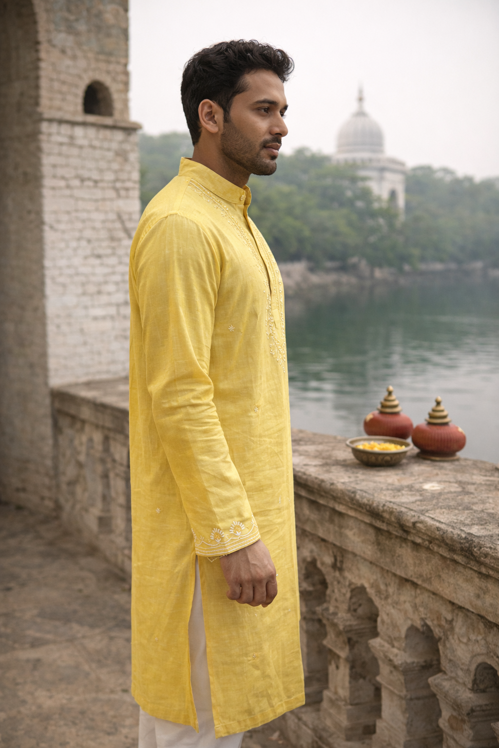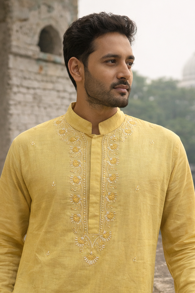 Step up your ethnic game with this mustard yellow cotton kurta for men. The warm festive hue is beautifully enhanced with intricate embroidery along the neckline and placket, adding refined traditional charm. Pair it with churidar or straight pants and classic mojaris for a polished, graceful, and sophisticated look