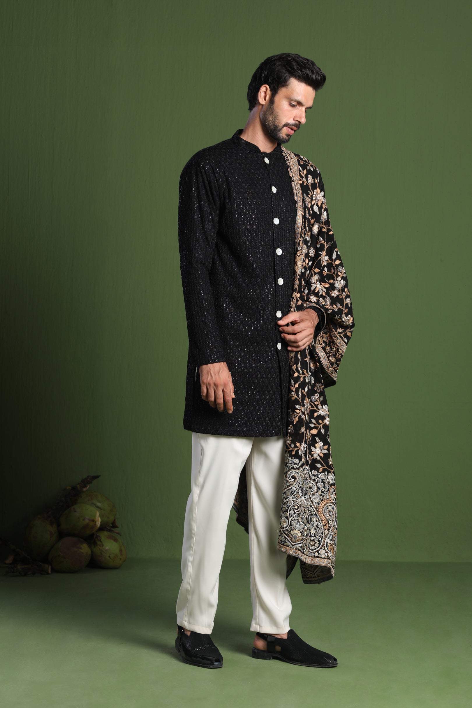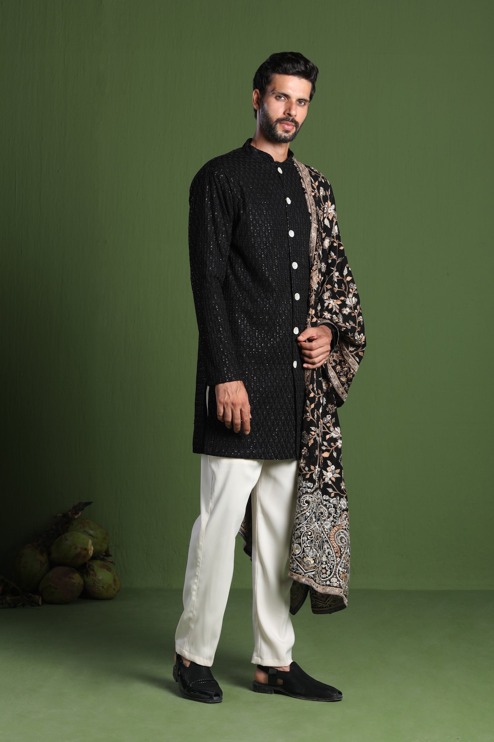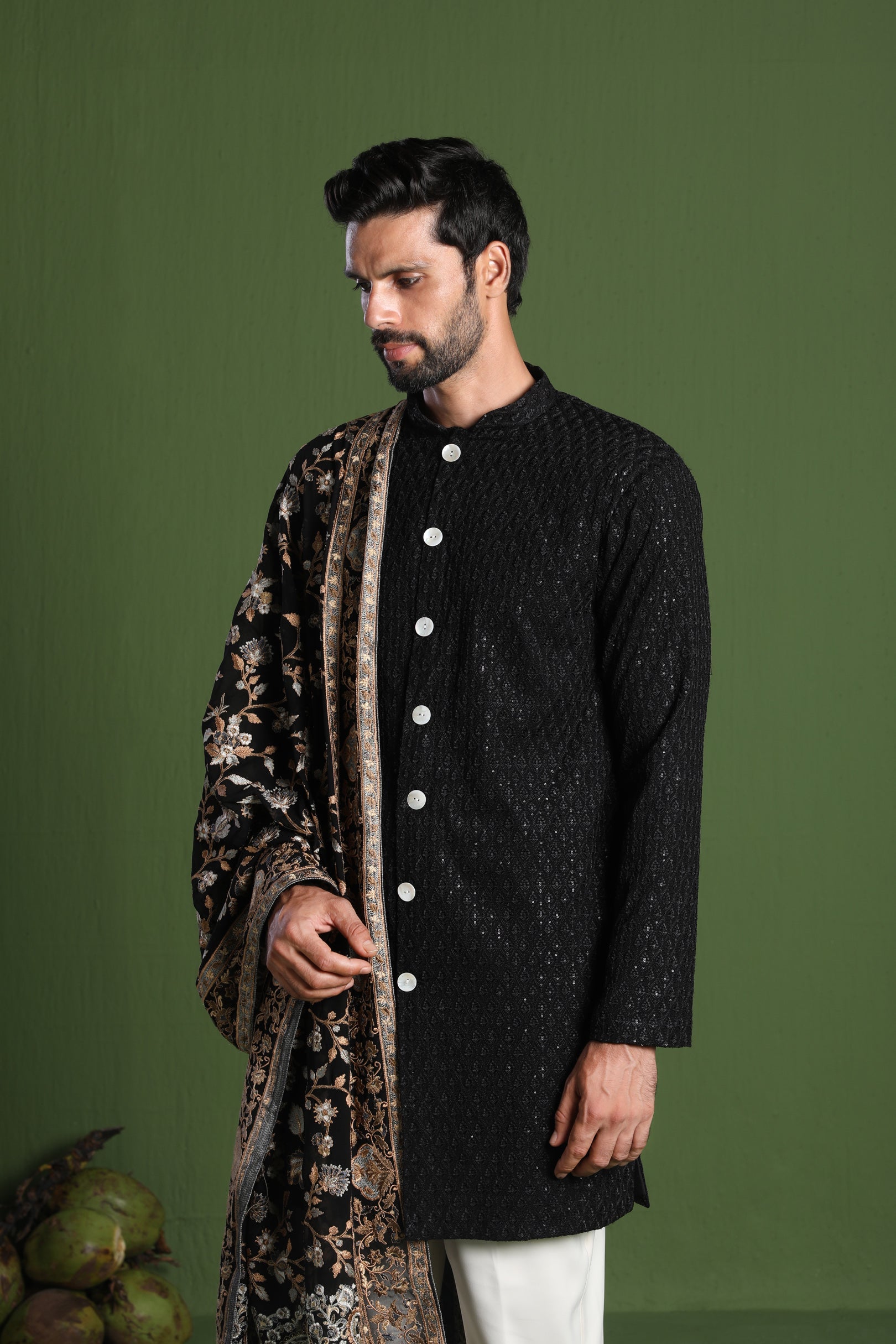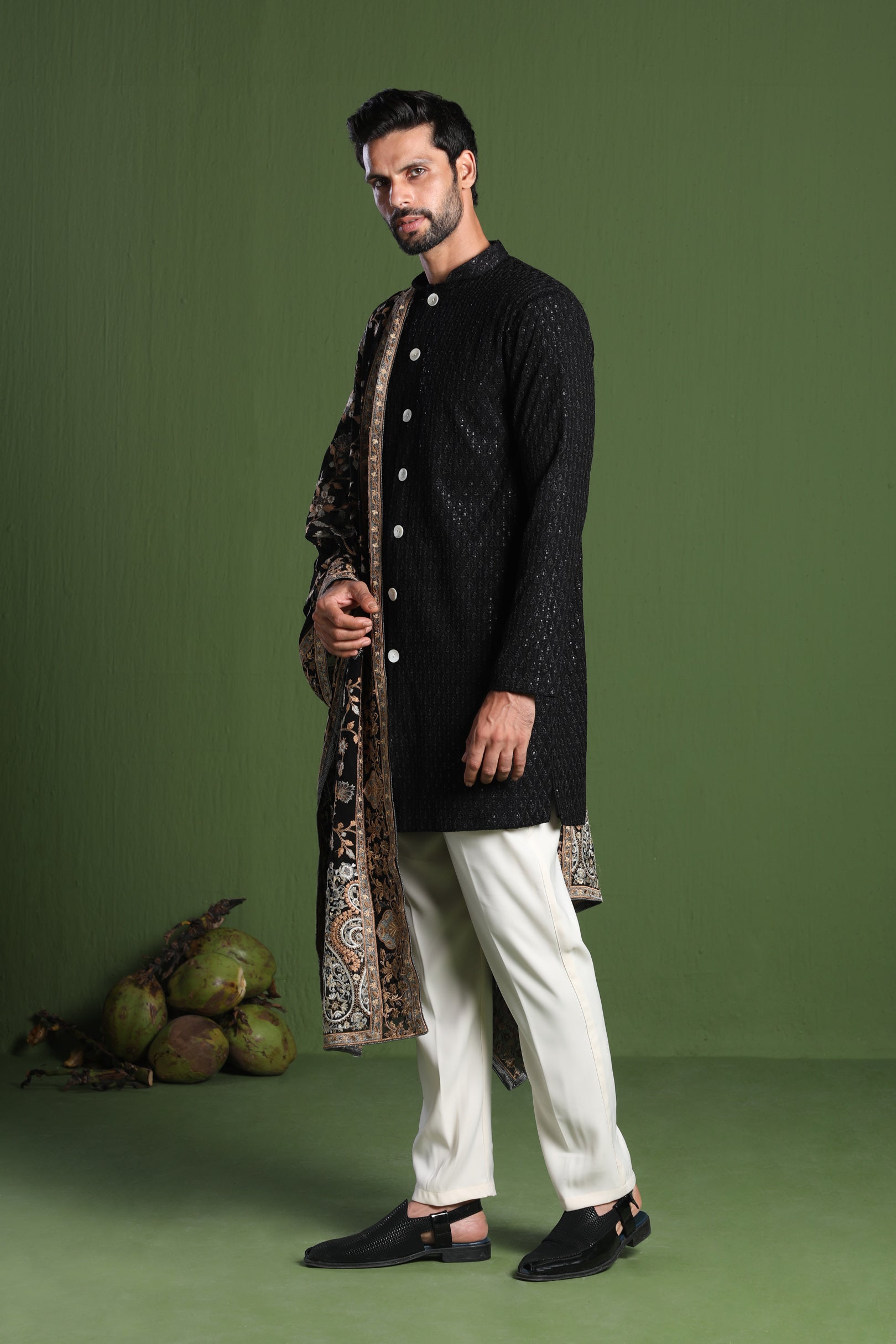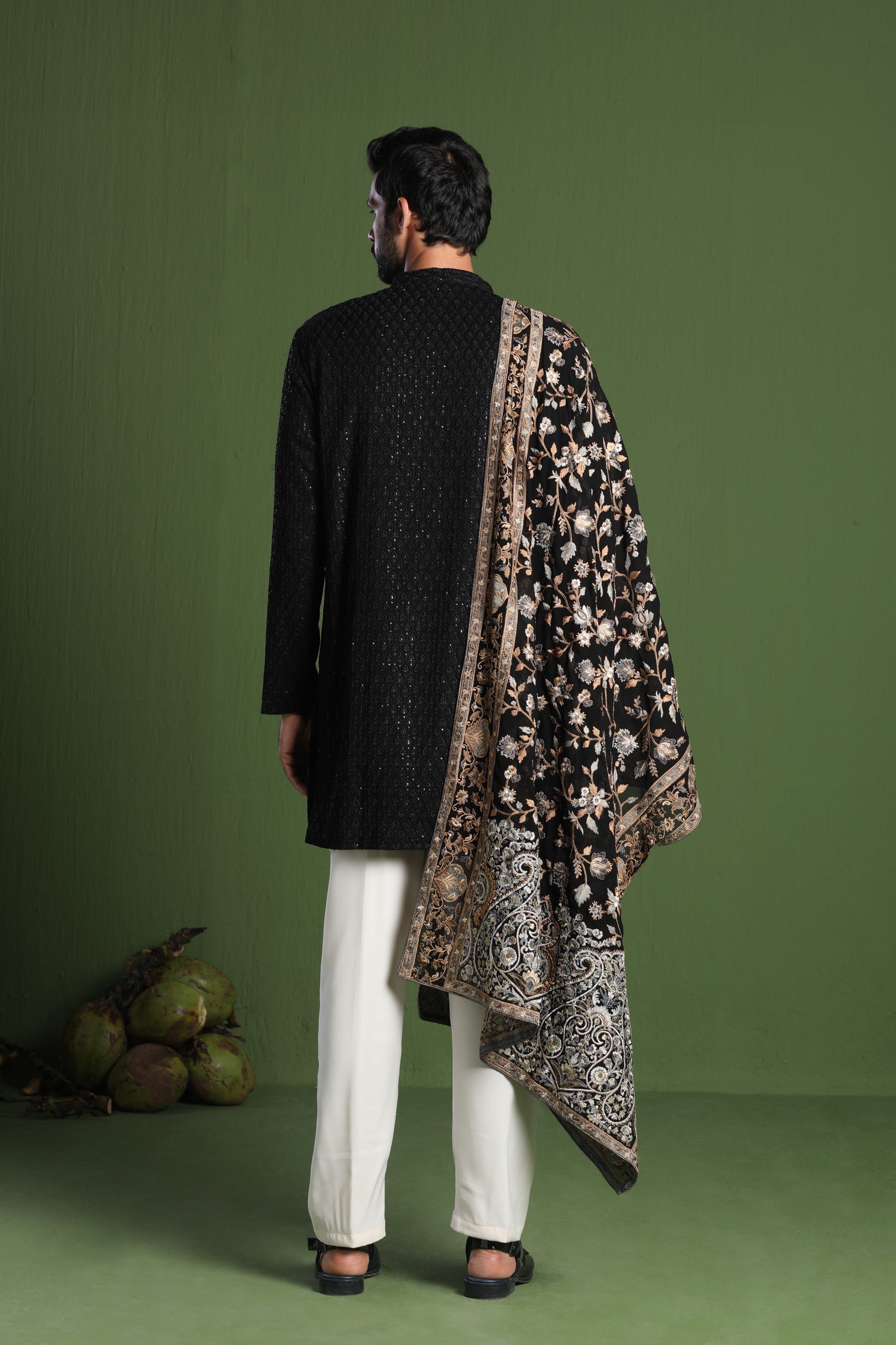 Designed for the modern traditionalist, this front-open kurta showcases exquisite Resham and sequinned embroidery. Paired with a heavy embroidered dupatta and ivory trousers, this piece exudes elegance and sophistication. The kurta features two pockets and a pure viscose lining for a luxurious feel.