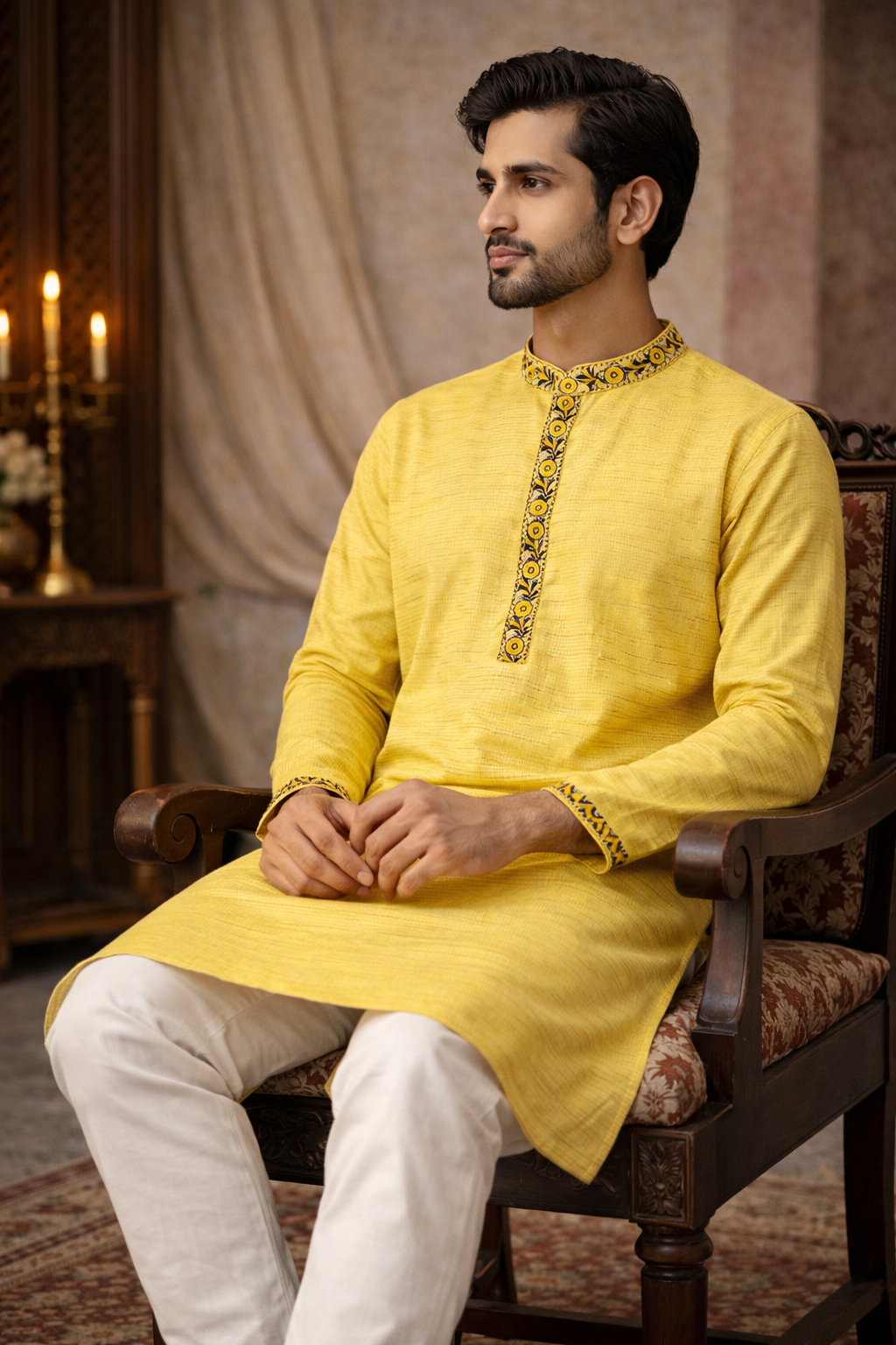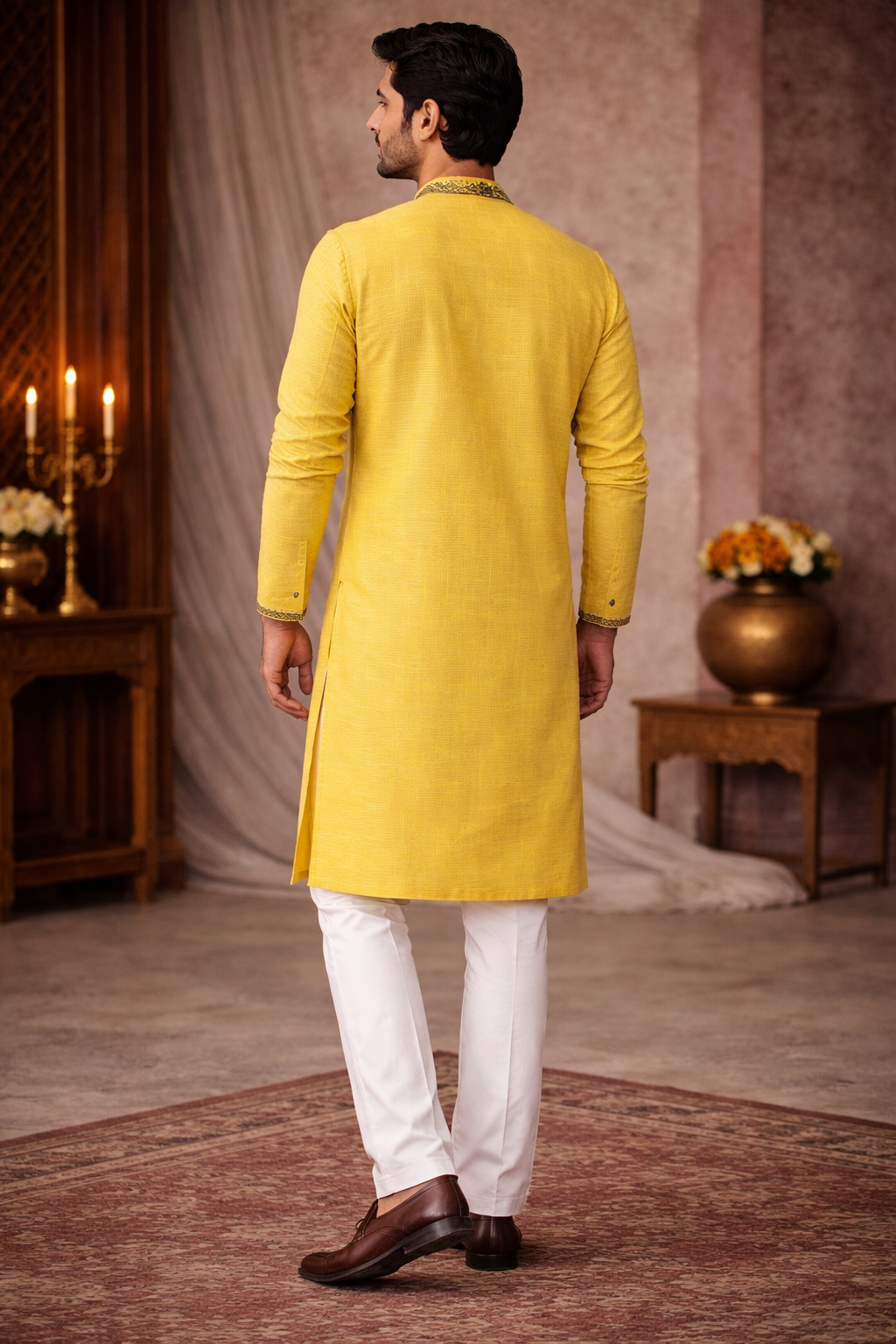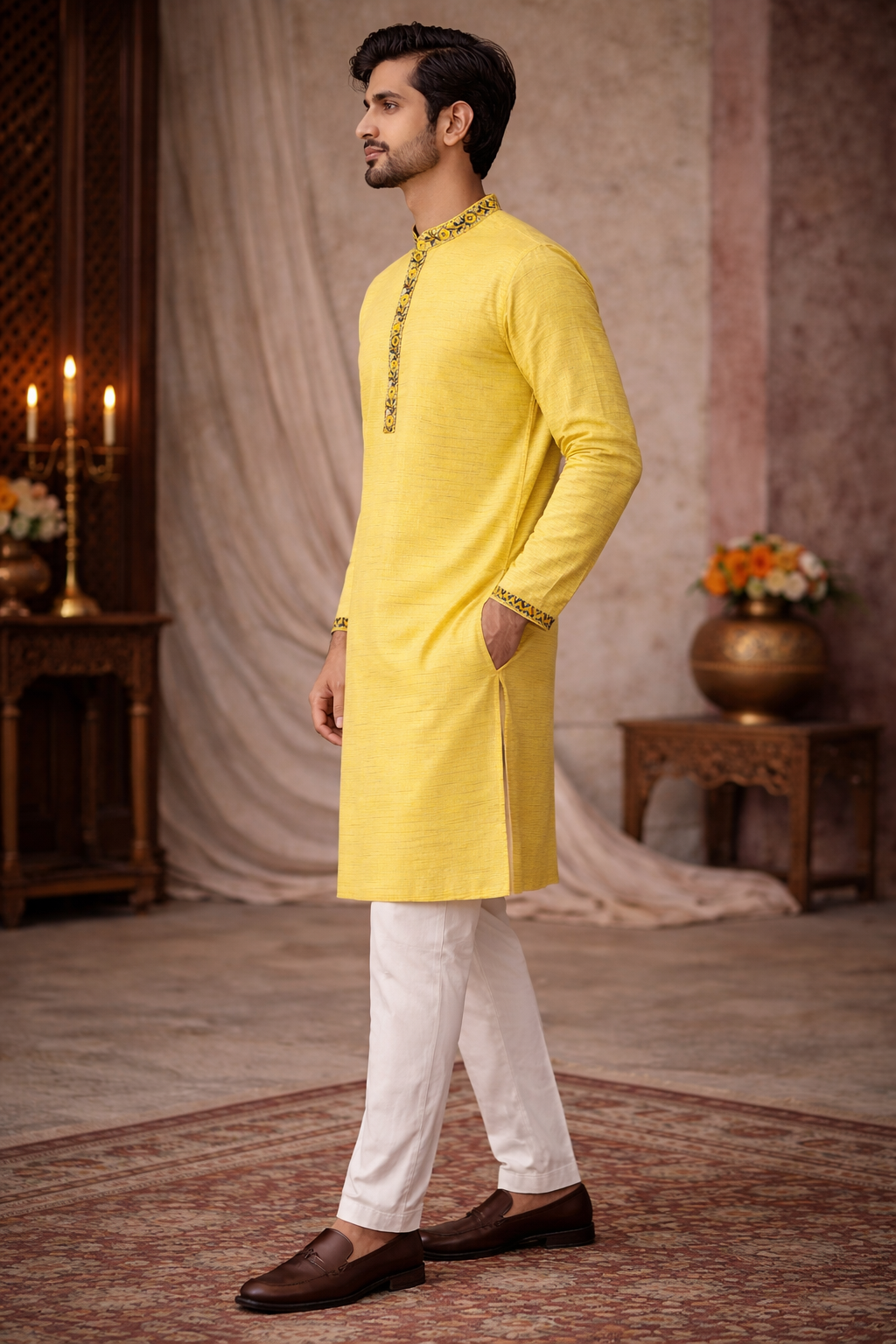 Step up your ethnic game with this vibrant yellow silk blend kurta for men. The bright festive hue is beautifully highlighted by intricate embroidered detailing along the neckline and placket, adding refined traditional charm. Pair it with churidar or straight pants and classic mojaris for a polished, elegant, and sophisticated look.